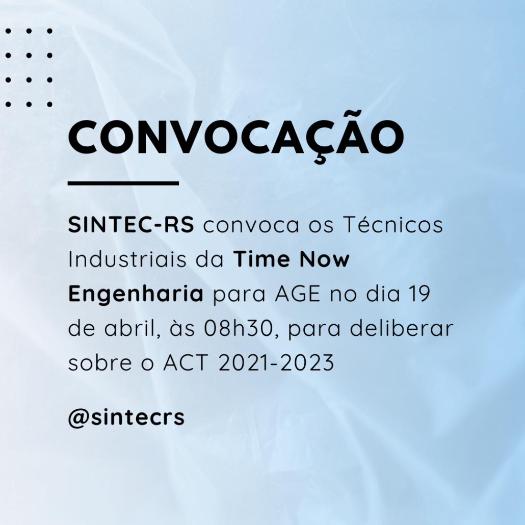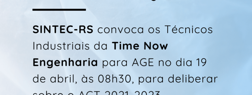 O Diretor-Presidente do SINDICATO DOS TÉCNICOS INDUSTRIAIS DE NÍVEL MÉDIO (2º grau) DO ESTADO DO RIO GRANDE DO SUL, no uso de suas atribuições legais e estatutárias, com base no Art. 5º, XXXV, 7º,VI, XIII, XIV, XXII e XXVI da CF/88, fundamentados pelos Art’s 8, 511 a 514, 545 a 548 e 578, 611 A, 620 da CLT , bem como pelo Art. 104 do Código Civil e também pelas Convenções nºs 103, 135, 154, E 158 da OIT; e pela Súmula 372 TST, convoca os Técnicos Industriais integrantes da categoria profissional, empregados da TIME NOW Engenharia, para ASSEMBLEIA GERAL EXTRAORDINÁRIA, a realizar-se no dia 19 de abril de 2022, de maneira virtual pela plataforma GOOGLE Meet (link disponibilizado por e-mail), às 08h00min em primeira chamada e às 08h30min em segunda chamada, para deliberarem