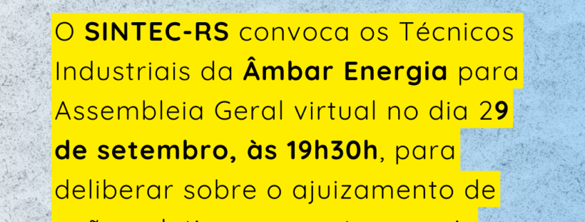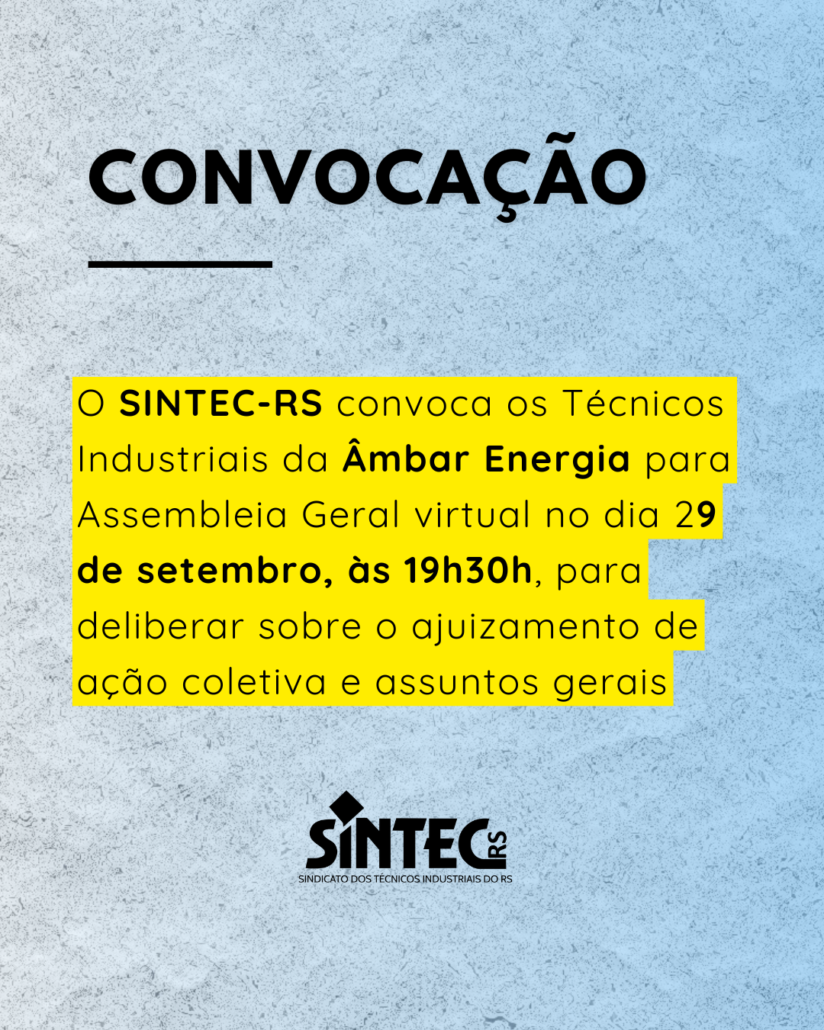 O Diretor-Presidente do SINDICATO DOS TÉCNICOS INDUSTRIAIS DE NÍVEL MÉDIO DO ESTADO DO RIO GRANDE DO SUL – SINTEC-RS, no uso de suas atribuições legais e estatutárias, convoca categoria dos Técnicos Industriais empregados da ÂMBAR ENERGIA para ASSEMBLEIA GERAL EXTRAORDINÁRIA a realizar-se no dia 29 de setembro de 2025, em formato virtual pela plataforma Google Meet (link disponibilizado por e-mail), às 19h00min em primeira chamada e às 19h30min em segunda chamada, para deliberarem sobre a seguinte ORDEM DO DIA: