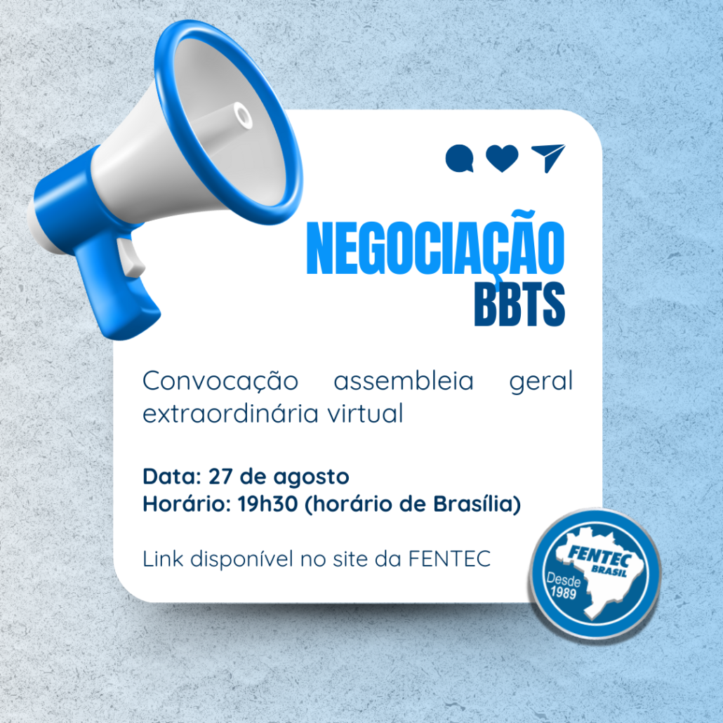 O Diretor-Presidente do SINDICATO DOS TÉCNICOS INDUSTRIAIS DE NÍVEL MÉDIO (2º grau) DO ESTADO DO RIO GRANDE DO SUL, no uso de suas atribuições legais e estatutárias, com base no Art. 5º, XXXV, 7º,VI, XIII, XIV, XXII e XXVI da CF/88, fundamentados pelos Art’s 8, 511 a 514, 545 a 548 e 578, 611 A, 620 da CLT , bem como pelo Art. 104 do Código Civil e também pelas Convenções nºs 103, 135, 154, E 158 da OIT; e pela Súmula 372 TST, em conjunto com a FEDERAÇÃO NACIONAL DOS TÉCNICOS INDUSTRIAIS, entidade sindical de grau superior, convocam todos os Técnicos e Técnicas industriais, em suas diversas modalidades, que exercem suas atividades laborais na empresa BANCO DO BRASIL TECNOLOGIA E SERVIÇOS, para participarem da ASSEMBLEIA GERAL EXTRAORDINÁRIA na modalidade virtual/online por meio da plataforma Zoom (link disponível no site da FENTEC www.fentec.org.br) a ser realizada no dia, 27/08/2024 às 18h30 (horário de Brasília) em 1ª chamada, e às 19h30 (horário de Brasília) em 2ª e última chamada, com qualquer número de presentes/conectados, transmitida ao vivo através do aplicativo Zoom ou outro similar que será amplamente divulgado para os interessados e estará disponibilizado através de um link na página oficial da FENTEC, assim todos poderão participar online. A assembleia irá discutir as seguintes propostas – ORDEM DO DIA: