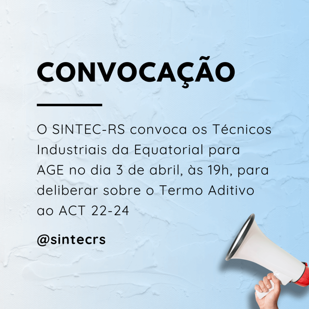 O Diretor-Presidente do SINDICATO DOS TÉCNICOS INDUSTRIAIS DE NÍVEL MÉDIO DO ESTADO DO RIO GRANDE DO SUL – SINTEC-RS, no uso de suas atribuições legais e estatutárias, convoca categoria dos Técnicos Industriais empregados da CEEE-D EQUATORIAL ENERGIA para ASSEMBLEIA GERAL EXTRAORDINÁRIA a realizar-se no dia 3 de abril de 2023, de forma virtual pela plataforma Google Meet (link disponibilizado por e-mail) às 18h30min em primeira chamada e às 19h00min em segunda chamada, para deliberarem sobre a seguinte ORDEM DO DIA: