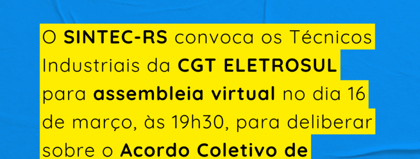 O Diretor-Presidente do SINDICATO DOS TÉCNICOS INDUSTRIAIS DE NÍVEL MÉDIO DO ESTADO DO RIO GRANDE DO SUL – SINTEC-RS, no uso de suas atribuições legais e estatutárias, convoca categoria dos Técnicos Industriais empregados da AXIA/CGT ELETROSUL para ASSEMBLEIA GERAL EXTRAORDINÁRIA a realizar-se no dia 16 de março de 2026, em formato virtual pela plataforma Google Meet (link disponibilizado por e-mail), às 19h00min em primeira chamada e às 19h30min em segunda chamada, para deliberarem sobre a seguinte ORDEM DO DIA: