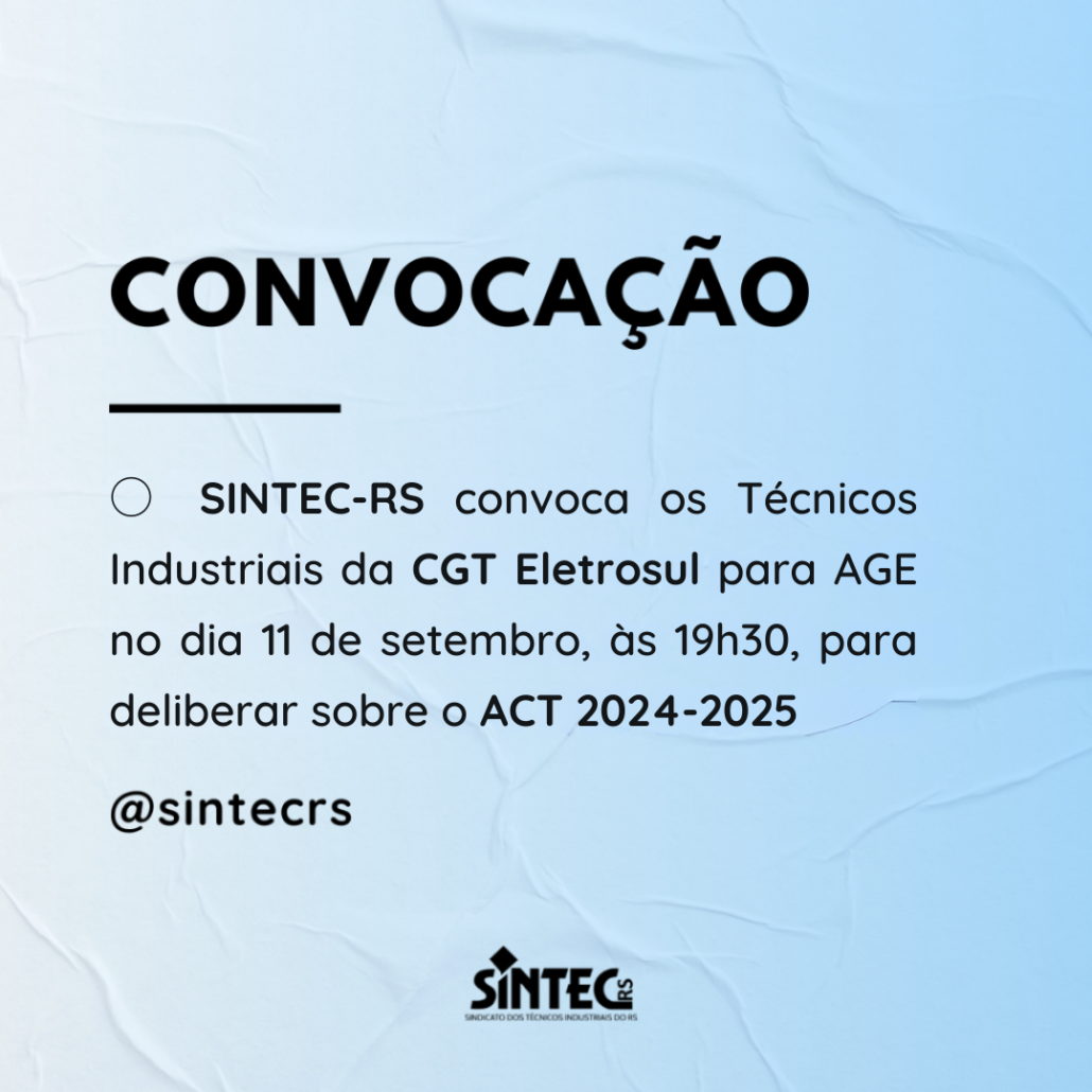 O Diretor-Presidente do SINDICATO DOS TÉCNICOS INDUSTRIAIS DE NÍVEL MÉDIO DO ESTADO DO RIO GRANDE DO SUL – SINTEC/RS, no uso de suas atribuições legais e estatutárias, convoca os Técnicos Industriais da CGT ELETROSUL para ASSEMBLEIA GERAL EXTRAORDINÁRIA, a realizar-se no dia 11 de setembro de 2024, de forma virtual, pela plataforma Google Meet (link disponibilizado por e-mail) às 19h00min em primeira chamada e às 19h30min, em segunda chamada, para deliberarem sobre a seguinte ORDEM DO DIA:
