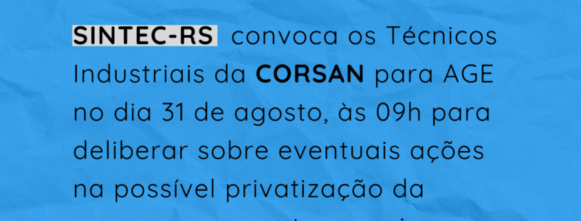 O Diretor-Presidente do SINDICATO DOS TÉCNICOS INDUSTRIAIS, convoca os Técnicos Industriais e Técnicos em Química, integrantes da categoria profissional da COMPANHIA RIOGRANDENSE DE SANEAMENTO-CORSAN, para ASSEMBLEIA GERAL EXTRAORDINÁRIA, a realizar-se no dia 31 de agosto de 2021, na sede do SINTEC-RS, Avenida Borges de Medeiros 328, cj 112, Centro Histórico – Porto Alegre/RS, às 09h00min em primeira chamada e às 10h30min em segunda chamada, para deliberarem sobre a seguinte ORDEM DO DIA:
