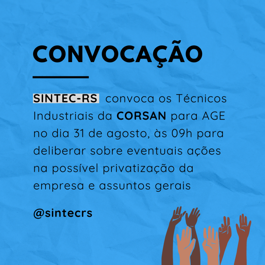 O Diretor-Presidente do SINDICATO DOS TÉCNICOS INDUSTRIAIS, convoca os Técnicos Industriais e Técnicos em Química, integrantes da categoria profissional da COMPANHIA RIOGRANDENSE DE SANEAMENTO-CORSAN, para ASSEMBLEIA GERAL EXTRAORDINÁRIA, a realizar-se no dia 31 de agosto de 2021, na sede do SINTEC-RS, Avenida Borges de Medeiros 328, cj 112, Centro Histórico – Porto Alegre/RS, às 09h00min em primeira chamada e às 10h30min em segunda chamada, para deliberarem sobre a seguinte ORDEM DO DIA: