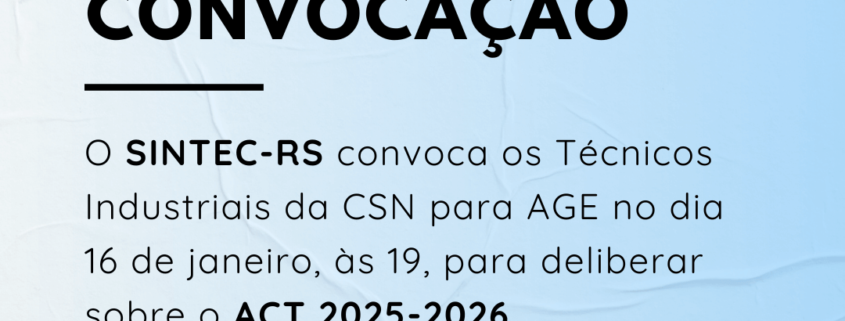 O Diretor-Presidente do SINDICATO DOS TÉCNICOS INDUSTRIAIS DE NÍVEL MÉDIO DO ESTADO DO RIO GRANDE DO SUL – SINTEC-RS, no uso de suas atribuições legais e estatutárias, convoca categoria dos Técnicos Industriais empregados da CSN CEEE-G para ASSEMBLEIA GERAL EXTRAORDINÁRIA a realizar-se no dia 16 de janeiro de 2025, em formato virtual pela plataforma Google Meet (link disponibilizado por e-mail), às 18h30min em primeira chamada e às 19h00min em segunda chamada, para deliberarem sobre a seguinte ORDEM DO DIA: