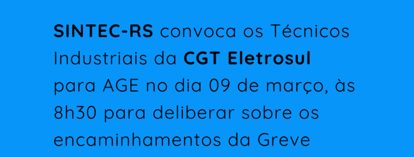 O Diretor-Presidente do SINDICATO DOS TÉCNICOS INDUSTRIAIS DE NÍVEL MÉDIO (2º GRAU) DO ESTADO DO RIO GRANDE DO SUL, no uso de suas atribuições legais e estatutárias, convoca os Técnicos Industriais integrantes da categoria profissional da ELETROBRAS – CGT ELETROSUL, para ASSEMBLEIA GERAL EXTRAORDINÁRIA, a realizar-se no dia 09 de março de 2022, de maneira virtual, através da plataforma Google Meet (link disponibilizado por e-mail) às 8h00min em primeira chamada e às 8h30min em segunda chamada, para deliberarem sobre a seguinte ORDEM DO DIA: