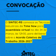 O Diretor-Presidente do SINDICATO DOS TÉCNICOS INDUSTRIAIS DE NÍVEL MÉDIO DO ESTADO DO RIO GRANDE DO SUL – SINTEC-RS, no uso de suas atribuições legais e estatutárias, convoca a categoria dos Técnicos Industriais empregados da ELETROBRAS – CGT ELETROSUL para continuidade da ASSEMBLEIA GERAL EXTRAORDINÁRIA, suspensa no dia 14/06/2022, a ser realizada no dia 08/07/2022, de maneira virtual, através da plataforma Google Meet (link disponibilizado por e-mail), às 08h00min em primeira chamada e às 08h30min, em segunda chamada, para deliberarem sobre a seguinte ORDEM DO DIA: