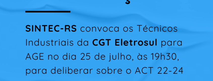 O Diretor-Presidente do SINDICATO DOS TÉCNICOS INDUSTRIAIS DE NÍVEL MÉDIO DO ESTADO DO RIO GRANDE DO SUL – SINTEC-RS, no uso de suas atribuições legais e estatutárias, convoca a categoria dos Técnicos Industriais empregados da ELETROBRAS – CGT ELETROSUL para continuidade da ASSEMBLEIA GERAL EXTRAORDINÁRIA, suspensa no dia 14/06/2022, a ser realizada no dia 25/07/2022, de maneira virtual, através da plataforma Google Meet (link disponibilizado por e-mail), às 19h00min em primeira chamada e às 19h30min, em segunda chamada, para deliberarem sobre a seguinte ORDEM DO DIA: