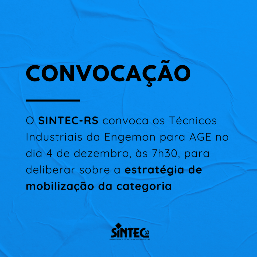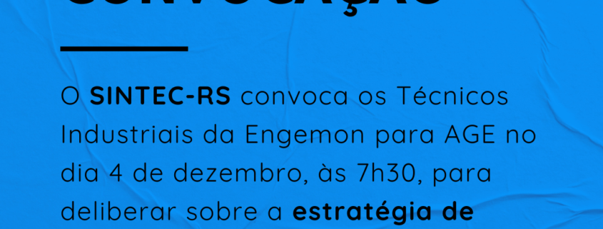 O Diretor-Presidente do SINDICATO DOS TÉCNICOS INDUSTRIAIS DE NÍVEL MÉDIO DO ESTADO DO RIO GRANDE DO SUL/SINTEC-RS, no uso de suas atribuições legais e estatutárias, convoca a categoria dos Técnicos Industriais empregados da ENGEMON para ASSEMBLEIA GERAL EXTRAORDINÁRIA, a realizar-se no dia 04/12/2024, na portaria de acesso da REFAP, localizada na Av. Getúlio Vargas, 11001 – Brigadeira, Canoas/RS, às 07h00 em primeira chamada e às 07h30 em segunda chamada, para deliberar sobre a seguinte ORDEM DO DIA: