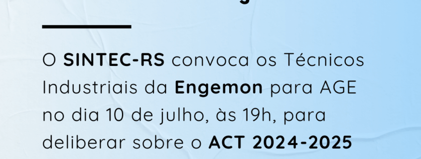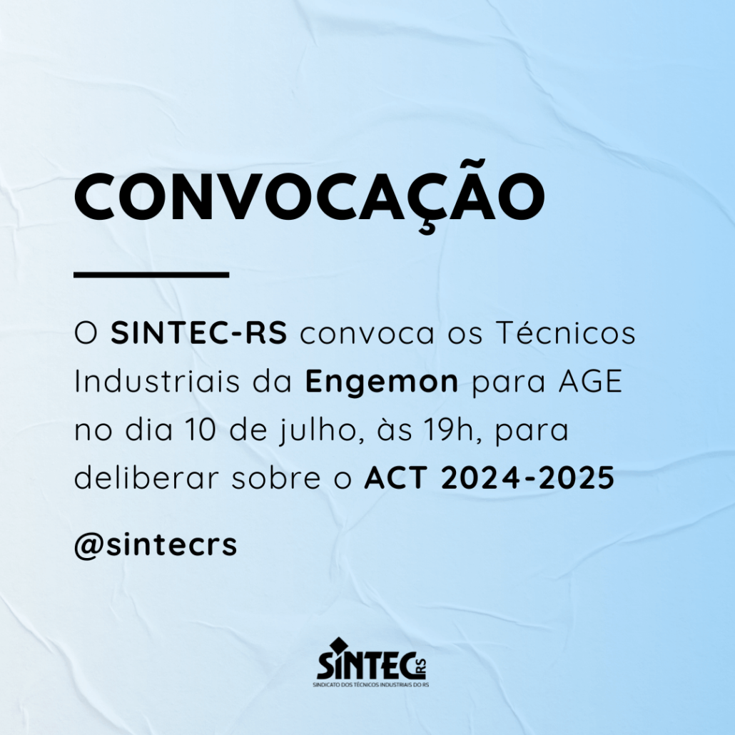 O Diretor-Presidente do SINDICATO DOS TÉCNICOS INDUSTRIAIS DE NÍVEL MÉDIO DO ESTADO DO RIO GRANDE DO SUL – SINTEC-RS, no uso de suas atribuições legais e estatutárias, com base no Art. 5º, XXXV, 7º,VI, XIII, XIV, XXII e XXVI da CF/88, fundamentados pelos Art’s 8, 511 a 514, 545 a 548 e 578, 611 A, 620 da CLT , bem como pelo Art. 104 do Código Civil e também pelas Convenções nºs 103, 135, 154, E 158 da OIT; e pela Súmula 372 TST, convoca categoria dos Técnicos Industriais empregados da ENGEMON, para ASSEMBLEIA GERAL EXTRAORDINÁRIA, a realizar-se no dia 10/07/2024, por meio virtual, através da plataforma Google Meet (link de acesso disponibilizado por e-mail), às 18h30min em primeira chamada e às 19h00min em segunda chamada, para deliberarem sobre a seguinte ORDEM DO DIA: