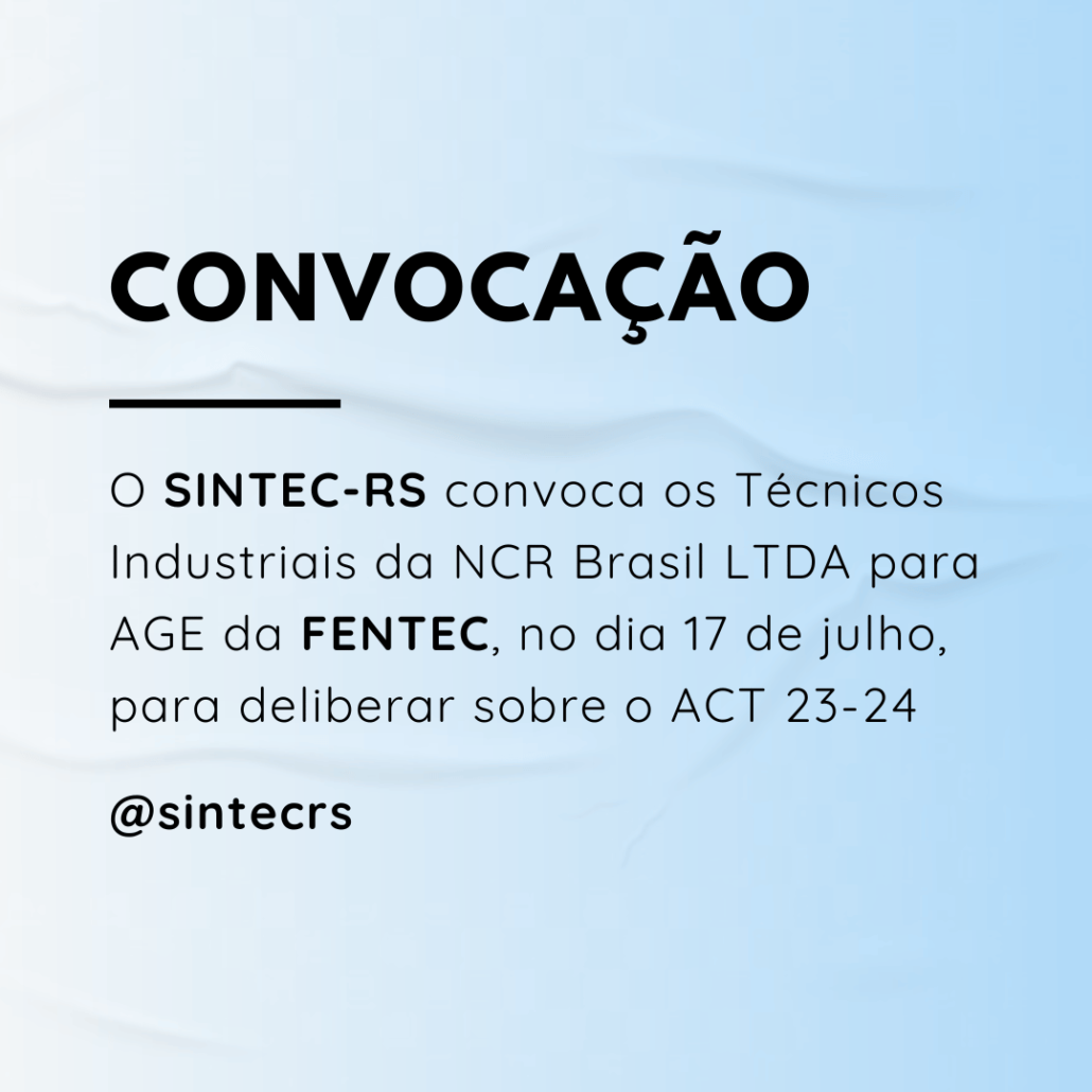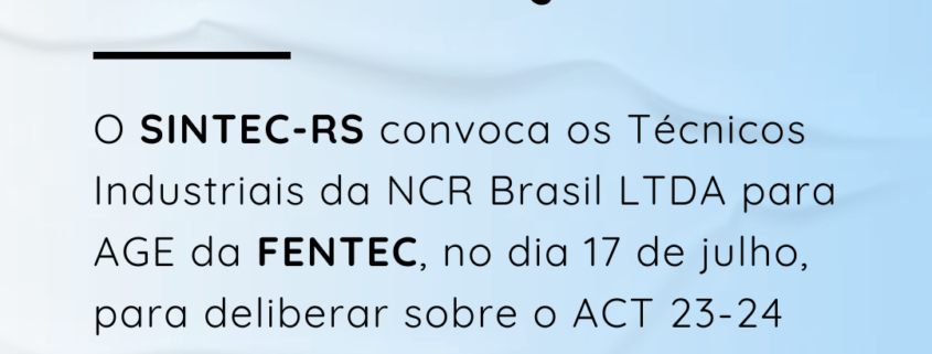 O SINTEC-RS convoca os Técnicos e Técnicas Industriais da NCR BRASIL LTDA para Assembleia Geral Extraordinária da FENTEC, a realizar-se no dia 17 de julho de 2023, de maneira virtual pela plataforma Zoom Meetings (link disponível no Boletim da FENTEC), às 16 horas, para discussão da contraproposta da empresa referente ao Acordo Coletivo de Trabalho 2023-2024 e outros assuntos de interesse da categoria.