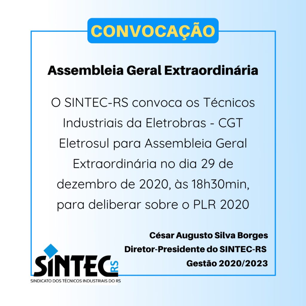 O Diretor-Presidente do SINDICATO DOS TÉCNICOS INDUSTRIAIS DE NÍVEL MÉDIO DO ESTADO DO RIO GRANDE DO SUL – SINTEC/RS, no uso de suas atribuições legais e estatutárias, convoca categoria dos Técnicos Industriais empregados da ELETROBRAS – CGT ELETROSUL para ASSEMBLEIA GERAL EXTRAORDINÁRIA, a realizar-se no dia 29/12/2020, de maneira virtual, através da plataforma ZOOM Meetings, às 18h30min em primeira chamada e às 19h00min, em segunda chamada para deliberarem sobre a seguinte ORDEM DO DIA: