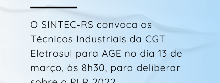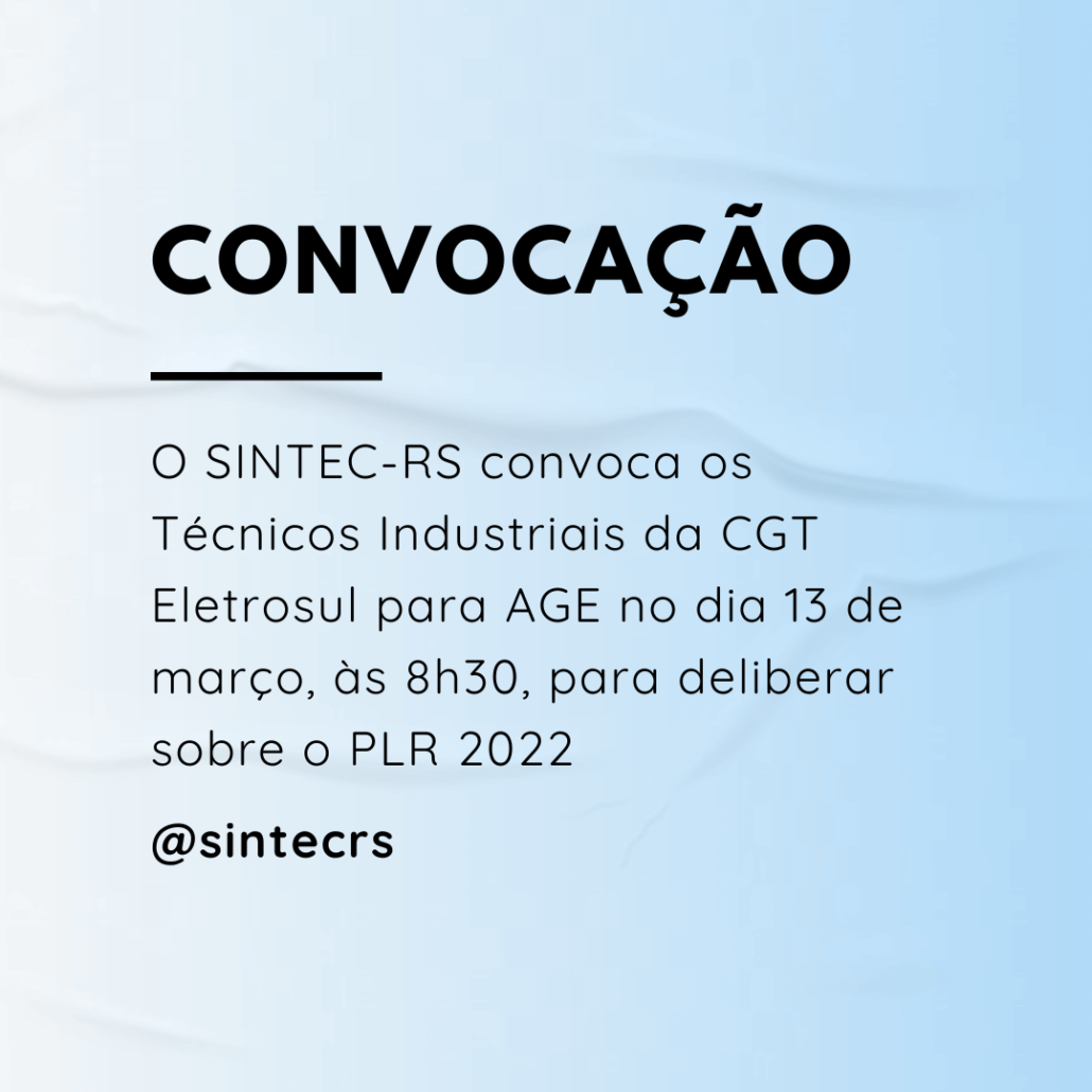 O Diretor-Presidente do SINDICATO DOS TÉCNICOS INDUSTRIAIS DE NÍVEL MÉDIO DO ESTADO DO RIO GRANDE DO SUL – SINTEC-RS, no uso de suas atribuições legais e estatutárias, convoca categoria dos Técnicos Industriais empregados da ELETROBRAS – CGT ELETROSUL para ASSEMBLEIA GERAL EXTRAORDINÁRIA a realizar-se no dia 13 de março de 2023, de forma virtual pela plataforma Google Meet (link disponibilizado por e-mail), às 08h00min em primeira chamada e às 08h30min em segunda chamada, para deliberarem sobre a seguinte ORDEM DO DIA: