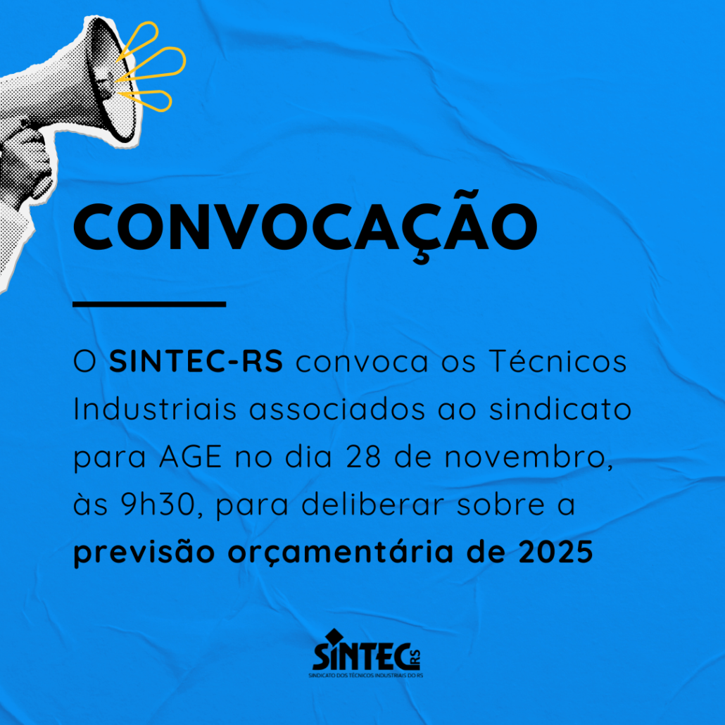 O Diretor-Presidente do SINDICATO DOS TÉCNICOS INDUSTRIAIS DE NÍVEL MÉDIO DO ESTADO DO RIO GRANDE DO SUL/SINTEC-RS, no uso de suas atribuições legais e estatutárias, convoca os Técnicos Industriais integrantes da categoria profissional, filiados ao sindicato, com base territorial em todo o Estado do Rio Grande do Sul, para ASSEMBLEIA GERAL EXTRAORDINÁRIA, a realizar-se no dia 28/11/2024, na sede do sindicato, localizado no Av. Borges de Medeiros, 328, 11º andar, conjunto 112 – Centro Histórico, Porto Alegre-RS às 09h00min em primeira chamada e às 09h30min em segunda chamada, para deliberarem sobre a seguinte ORDEM DO DIA: