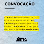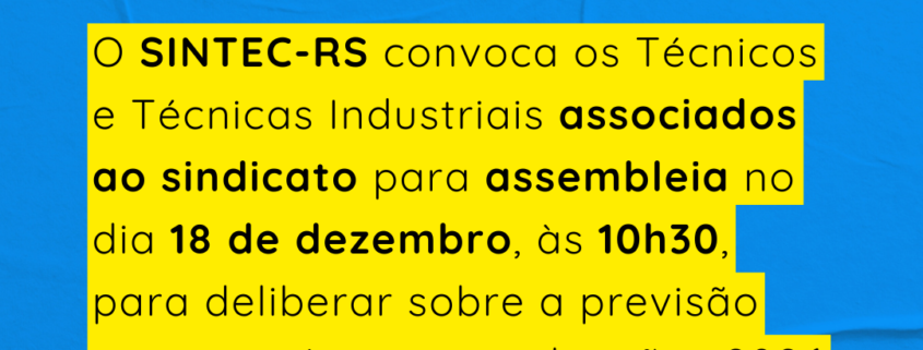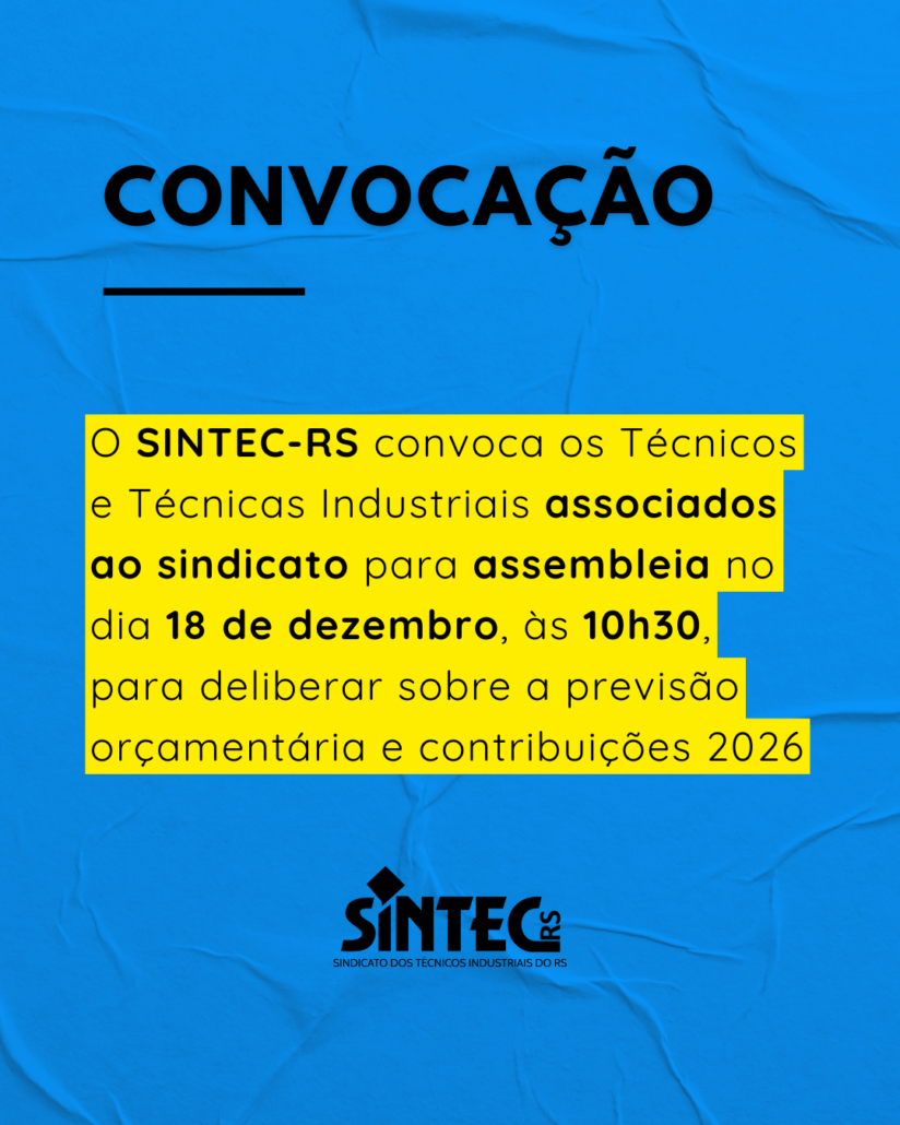 O Diretor-Presidente do SINDICATO DOS TÉCNICOS INDUSTRIAIS DE NÍVELMÉDIO DO ESTADO DO RIO GRANDE DO SUL/SINTEC-RS, no uso de suas atribuições legais e estatutárias, convoca os Técnicos Industriais integrantes da categoria profissional, filiados ao sindicato, com base territorial em todo o Estado do Rio Grande do Sul, para ASSEMBLEIA GERAL EXTRAORDINÁRIA, a realizar-se no dia 18/12/2025, na sede do sindicato, localizado na Av. Borges de Medeiros, 328, 11º andar, conjunto 112 – Centro Histórico, Porto Alegre-RS, e em formato virtual, pela plataforma Google Meet (link disponibilizado por e-mail) às 10h00min em primeira chamada e às 10h30min em segunda chamada, para deliberarem sobre a seguinte ORDEM DO DIA: