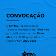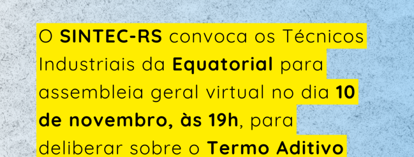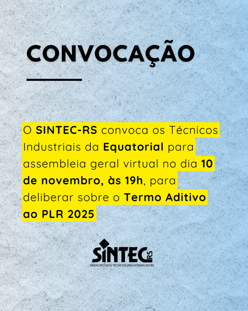 O Diretor-Presidente do SINDICATO DOS TÉCNICOS INDUSTRIAIS DE NÍVEL MÉDIO DO ESTADO DO RIO GRANDE DO SUL – SINTEC-RS, no uso de suas atribuições legais e estatutárias, convoca categoria dos Técnicos Industriais empregados da EQUATORIAL ENERGIA para ASSEMBLEIA GERAL EXTRAORDINÁRIA a realizar-se no dia 10 de novembro de 2025, em formato virtual pela plataforma Google Meet (link disponibilizado por e-mail), às 18h30min em primeira chamada e às 19h00min em segunda chamada, para deliberarem sobre a seguinte ORDEM DO DIA: