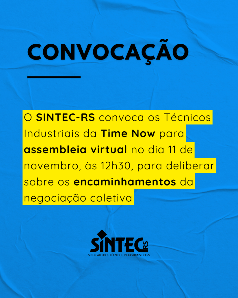O Diretor-Presidente do SINDICATO DOS TÉCNICOS INDUSTRIAIS DE NÍVEL MÉDIO DO ESTADO DO RIO GRANDE DO SUL – SINTEC-RS, no uso de suas atribuições legais e estatutárias, convoca categoria dos Técnicos Industriais empregados da TIME NOW ENGENHARIA para ASSEMBLEIA GERAL EXTRAORDINÁRIA a realizar-se no dia 11 de novembro de 2025, em formato virtual pela plataforma Google Meet (link disponibilizado por e-mail), às 12h00min em primeira chamada e às 12h30min em segunda chamada, para deliberarem sobre a seguinte ORDEM DO DIA: