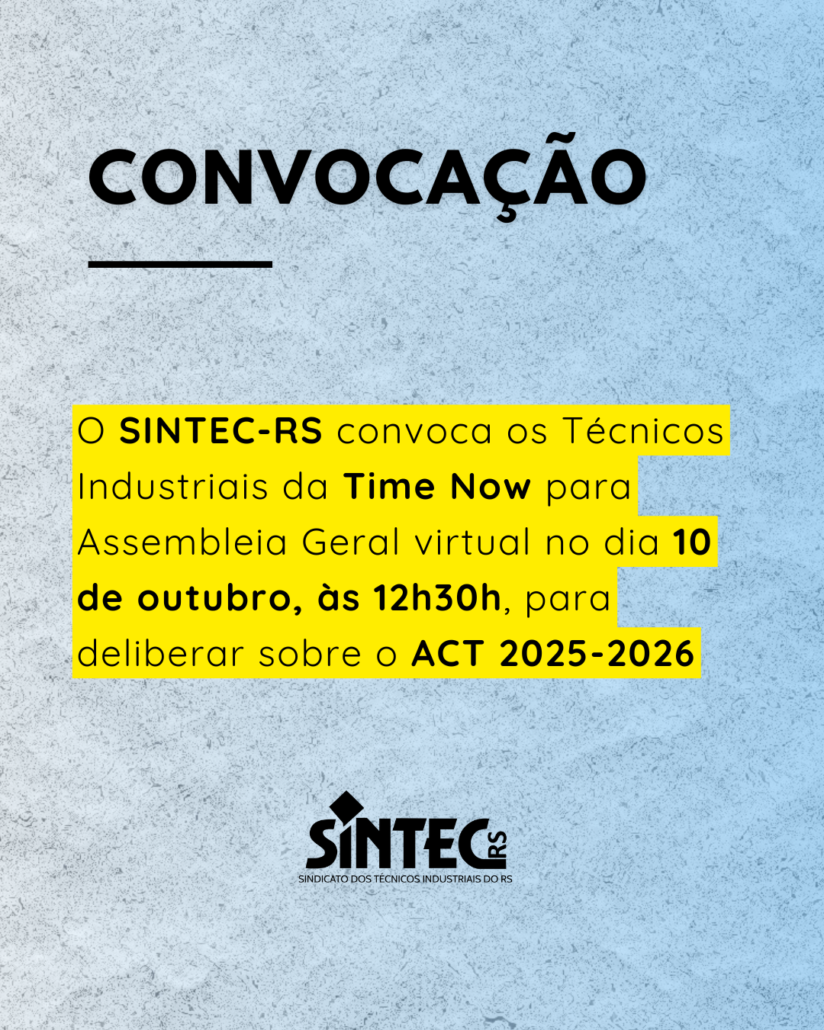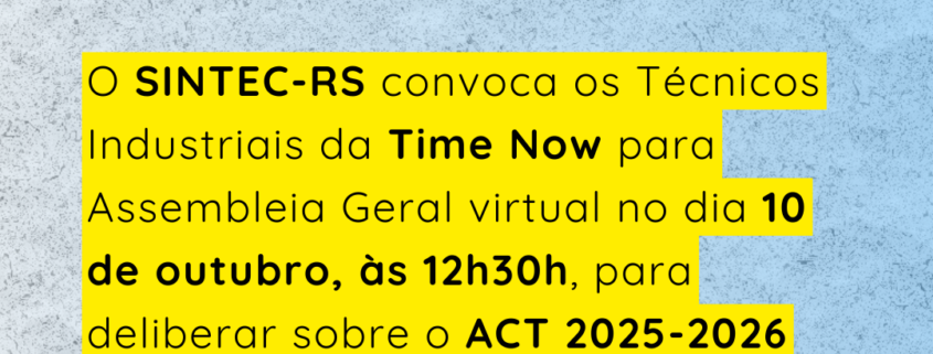 O Diretor-Presidente do SINDICATO DOS TÉCNICOS INDUSTRIAIS DE NÍVEL MÉDIO DO ESTADO DO RIO GRANDE DO SUL – SINTEC-RS, no uso de suas atribuições legais e estatutárias, convoca categoria dos Técnicos Industriais empregados da TIME NOW ENGENHARIA para ASSEMBLEIA GERAL EXTRAORDINÁRIA a realizar-se no dia 10 de outubro de 2025, em formato virtual pela plataforma Google Meet (link disponibilizado por e-mail), às 12h00min em primeira chamada e às 12h30min em segunda chamada, para deliberarem sobre a seguinte ORDEM DO DIA: