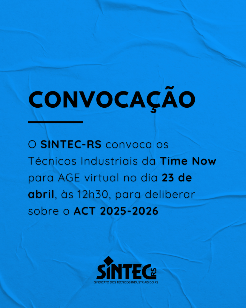 O Diretor-Presidente do SINDICATO DOS TÉCNICOS INDUSTRIAIS DE NÍVEL MÉDIO DO ESTADO DO RIO GRANDE DO SUL – SINTEC-RS, no uso de suas atribuições legais e estatutárias, convoca categoria dos Técnicos Industriais empregados da Time Now Engenharia para ASSEMBLEIA GERAL EXTRAORDINÁRIA a realizar-se no dia 23 de abril de 2025, em formato virtual pela plataforma Google Meet (link disponibilizado por e-mail), às 12h00min em primeira chamada e às 12h30min em segunda chamada, para deliberarem sobre a seguinte ORDEM DO DIA: