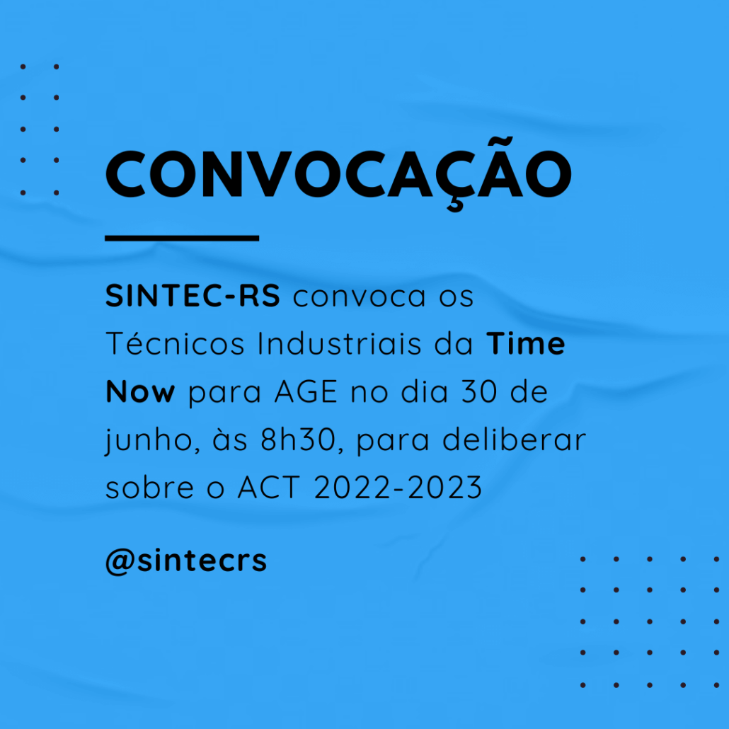 O Diretor-Presidente do SINDICATO DOS TÉCNICOS INDUSTRIAIS DE NÍVEL MÉDIO (2º GRAU) DO ESTADO DO RIO GRANDE DO SUL – SINTEC-RS, no uso de suas atribuições legais e estatutárias, convoca os Técnicos Industriais integrantes da categoria profissional, empregados da TIME NOW Engenharia, para ASSEMBLEIA GERAL EXTRAORDINÁRIA, a realizar-se no dia 30 de junho de 2022, de maneira virtual pela plataforma Google Meet (link disponibilizado por e-mail), às 08h00min em primeira chamada e às 08h30min em segunda chamada, para deliberarem sobre a seguinte ORDEM DO DIA: