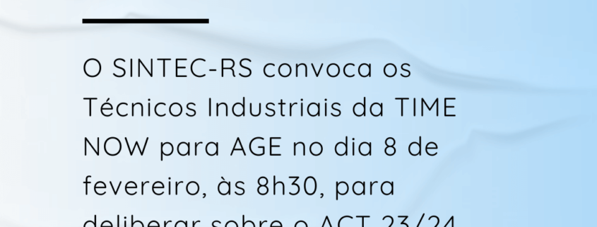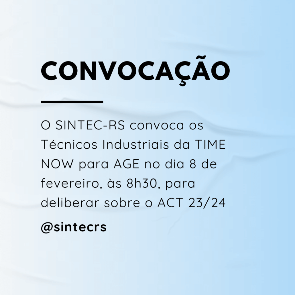 O Diretor-Presidente do SINDICATO DOS TÉCNICOS INDUSTRIAIS DE NÍVEL MÉDIO DO ESTADO DO RIO GRANDE DO SUL – SINTEC-RS, no uso de suas atribuições legais e estatutárias, convoca categoria dos Técnicos Industriais empregados da TIME NOW ENGENHARIA, para ASSEMBLEIA GERAL EXTRAORDINÁRIA, a realizar-se no dia 08/02/2023, por meio virtual, através da plataforma Google Meet (link de acesso disponibilizado por e-mail), às 08h00min em primeira chamada e às 08h30min em segunda chamada, para deliberarem sobre a seguinte ORDEM DO DIA: