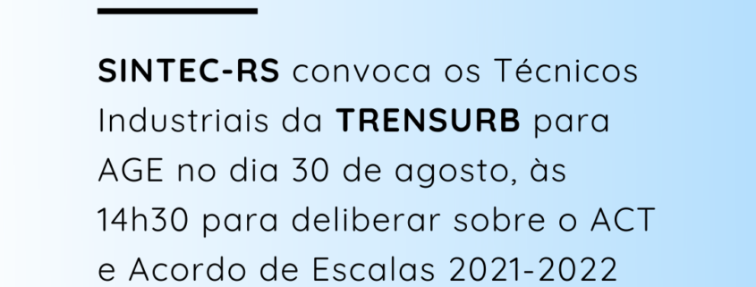 O Diretor-Presidente do SINDICATO DOS TÉCNICOS INDUSTRIAIS DE NÍVEL MÉDIO (2º grau) DO ESTADO DO RIO GRANDE DO SUL, no uso de suas atribuições legais e estatutárias, convoca os Técnicos Industriais, integrantes da categoria profissional da Empresa de Trens Urbanos de Porto Alegre-TRENSURB, para ASSEMBLEIA GERAL EXTRAORDINÁRIA, a realizar-se no dia 30 de agosto de 2021, de maneira virtual pela plataforma Google Meet (https://meet.google.com/gdj-vfhb-qox) e presencial na sede do SINTEC-RS, Avenida Borges de Medeiros 328, cj 112, Centro Histórico – Porto Alegre/RS às 14h00min em primeira chamada e às 14h30min em segunda chamada, para deliberarem sobre a seguinte ORDEM DO DIA: