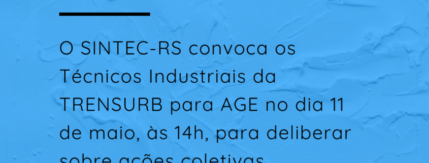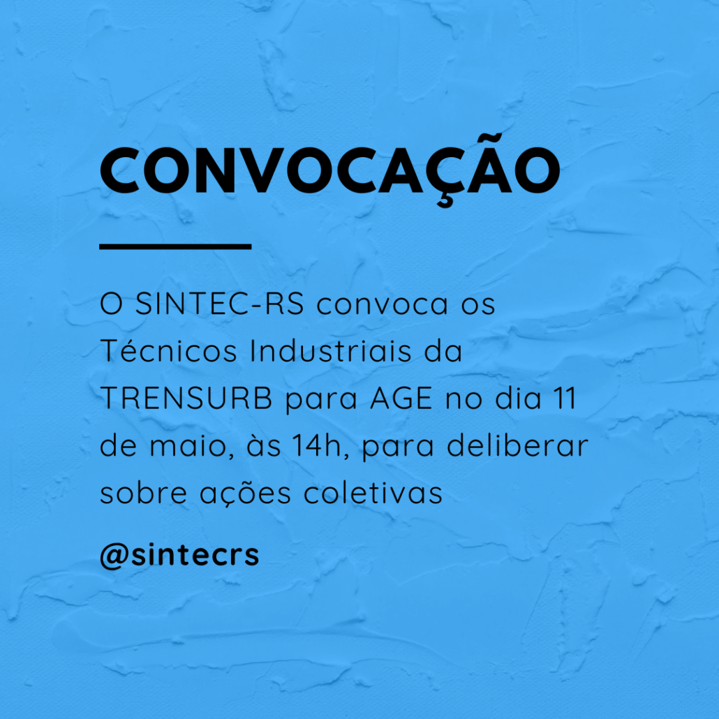 O Diretor Presidente do SINDICATO DOS TÉCNICOS INDUSTRIAIS DE NÍVEL MÉDIO DO ESTADO DO RIO GRANDE DO SUL – SINTEC-RS, no uso de suas atribuições legais, CONVOCA OS TÉCNICOS INDUSTRIAIS DA TRENSURB, para ASSEMBLEIA GERAL EXTRAORDINÁRIA de forma VIRTUAL, pelo aplicativo Google Meet (link disponibilizado por e-mail), a realizar-se no dia 11 de maio de 2023, às 13h30min em primeira chamada e às 14h00min em segunda chamada, para deliberar sobre a seguinte ordem do dia:
