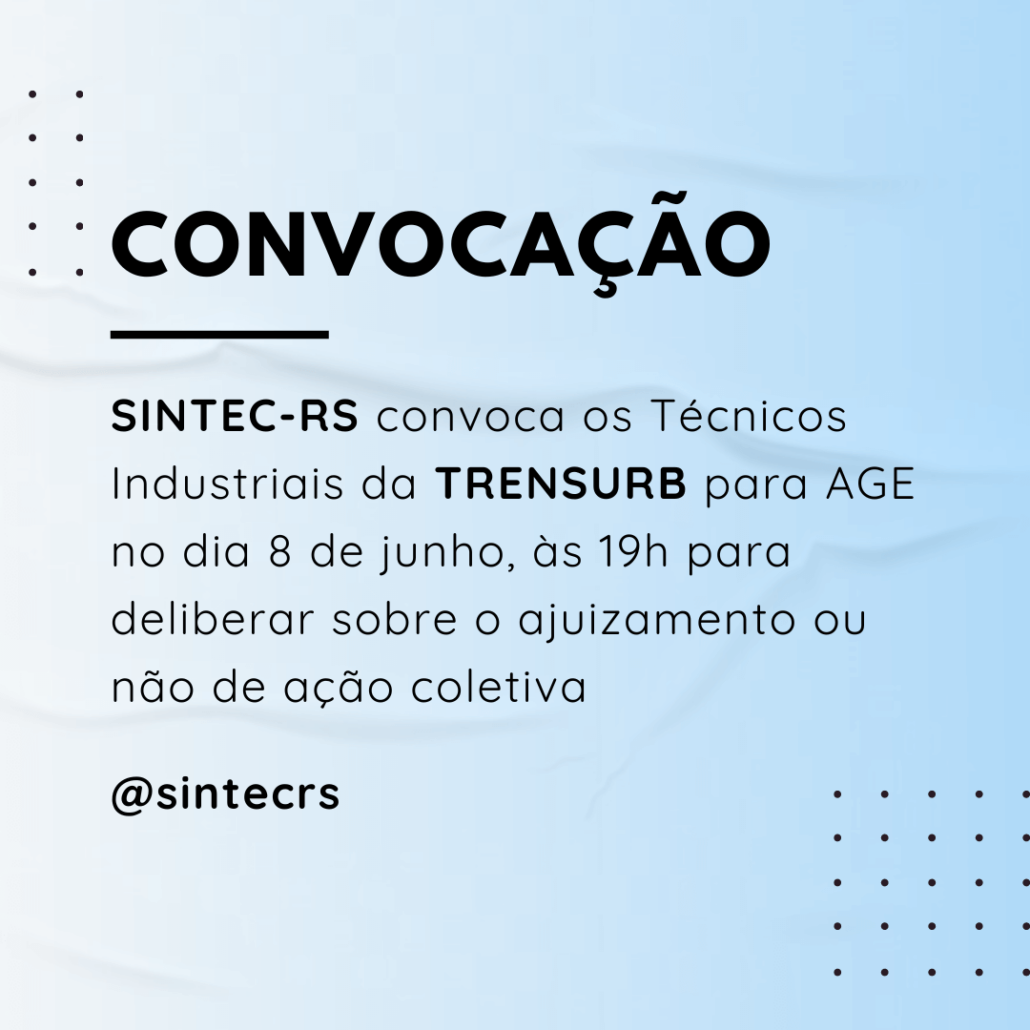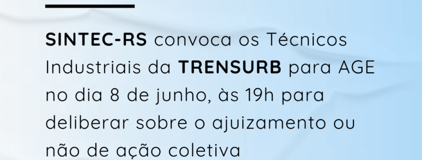 O Diretor Presidente do SINDICATO DOS TÉCNICOS INDUSTRIAIS DE NÍVEL MÉDIO DO ESTADO DO RIO GRANDE DO SUL – SINTEC-RS, no uso de suas atribuições legais, CONVOCA OS TÉCNICOS INDUSTRIAIS DA TRENSURB, para ASSEMBLEIA GERAL EXTRAORDINÁRIA de forma VIRTUAL, pelo aplicativo Google Meet (link disponibilizado por e-mail), a realizar-se no dia 08 de junho de 2022, às 18h30min em primeira chamada e às 19h00min em segunda chamada, para deliberar sobre a seguinte ordem do dia: