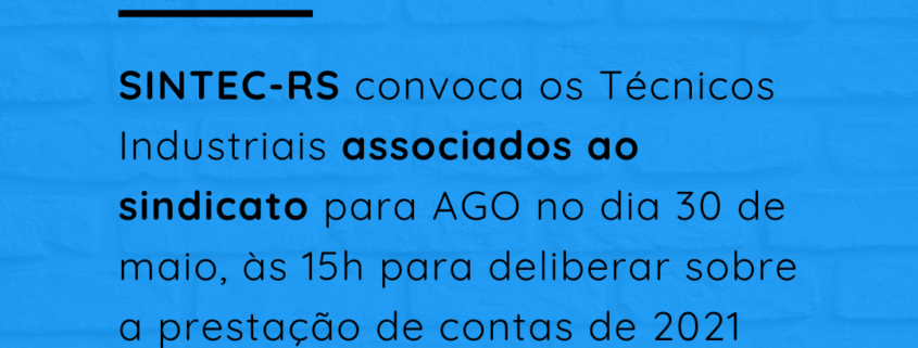 O Diretor-Presidente do SINDICATO DOS TÉCNICOS INDUSTRIAIS DE NÍVEL MÉDIO DO ESTADO DO RIO GRANDE DO SUL – SINTEC/RS, no uso de suas atribuições legais e estatutárias, alínea “a” do Art. 17 e em especial o Art. 18 do Estatuto vigente bem como sob a égide do Decreto Estadual nº 55.128, DE 19 DE MARÇO DE 2020, que Declarou Estado de Calamidade Pública no Rio Grande do Sul, em especial o Art. 2º, I, alínea B, e do Decreto Municipal nº 20.534, de 31/03/2020 que Decreta o estado de calamidade pública e consolida as medidas para enfrentamento da emergência de saúde pública de importância internacional decorrente do novo Coronavírus (COVID-19), no Município de Porto Alegre, convoca os Técnicos Industriais associados da entidade para ASSEMBLEIA GERAL ORDINÁRIA, a realizar-se no dia 30 de maio de 2022, de forma virtual, pela plataforma Google Meet (link enviado por e-mail) às 14h30min em primeira chamada e às 15h00min, em segunda chamada, para deliberarem sobre a seguinte ORDEM DO DIA: