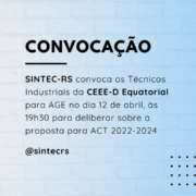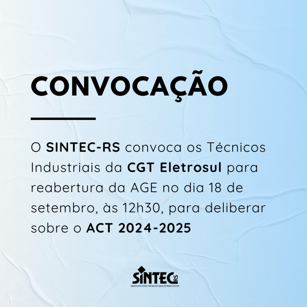 O Diretor-Presidente do SINDICATO DOS TÉCNICOS INDUSTRIAIS DE NÍVEL MÉDIO DO ESTADO DO RIO GRANDE DO SUL – SINTEC/RS, no uso de suas atribuições legais e estatutárias, convoca os Técnicos Industriais da CGT ELETROSUL para a reabertura da ASSEMBLEIA GERAL EXTRAORDINÁRIA realizada na última quarta-feira, 11, para deliberar sobre o Acordo Coletivo de Trabalho 2024-2025.