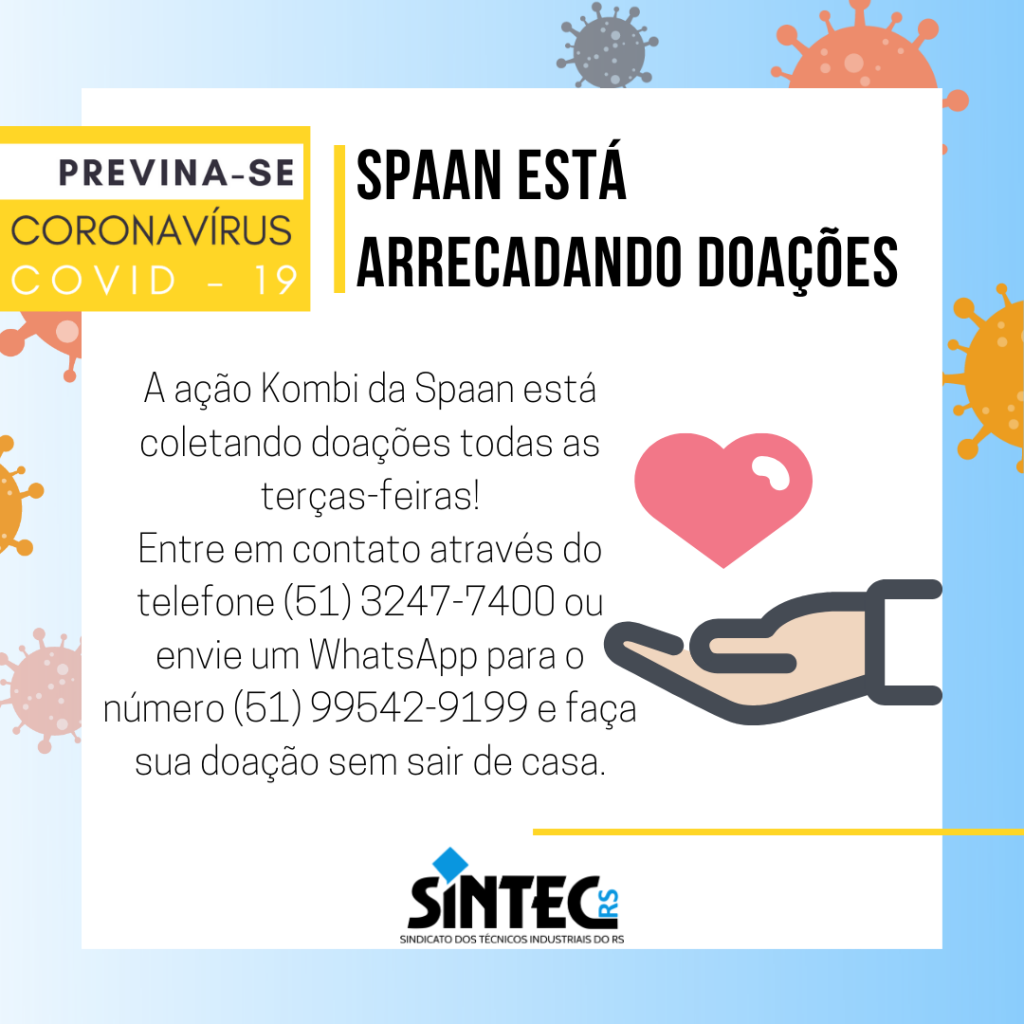 A ação Kombi da Spaan realiza todas as terças-feiras uma saída externa para coletar as doações. Para participar, entre em contato diretamente com a Spaan através do telefone (51) 3247-7400 ou envie um Whatsapp para (51) 99542-9199 e faça sua doação.
