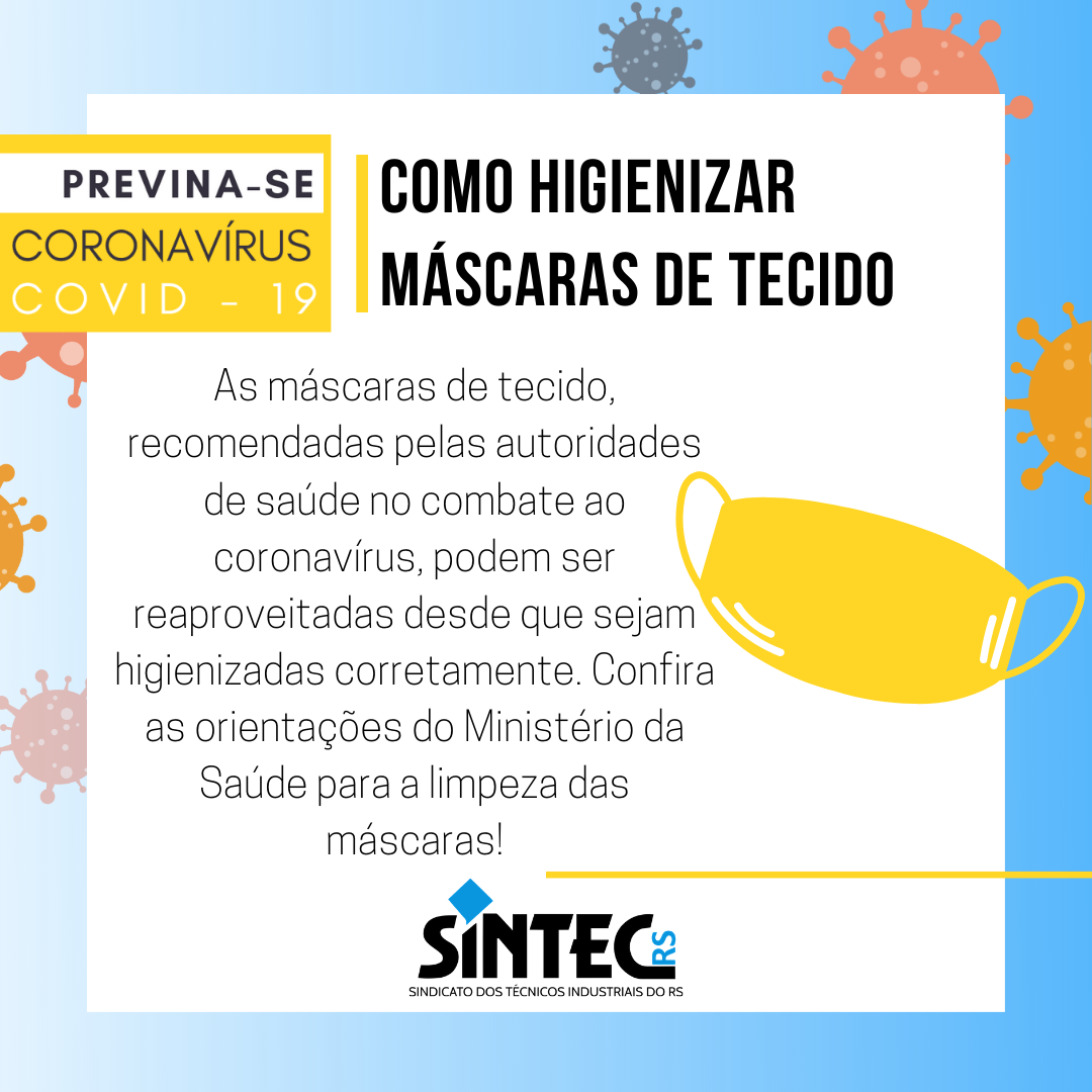 A proporção indicada é de 50 ml de água sanitária para um litro de água. Após, as máscaras devem secar ao sol e, de preferência, serem passadas a ferro. Quando já estiver limpa e seca, a máscara pode ser guardada dentro de um saco plástico limpo, enrolada em papel toalha, para evitar a umidade.