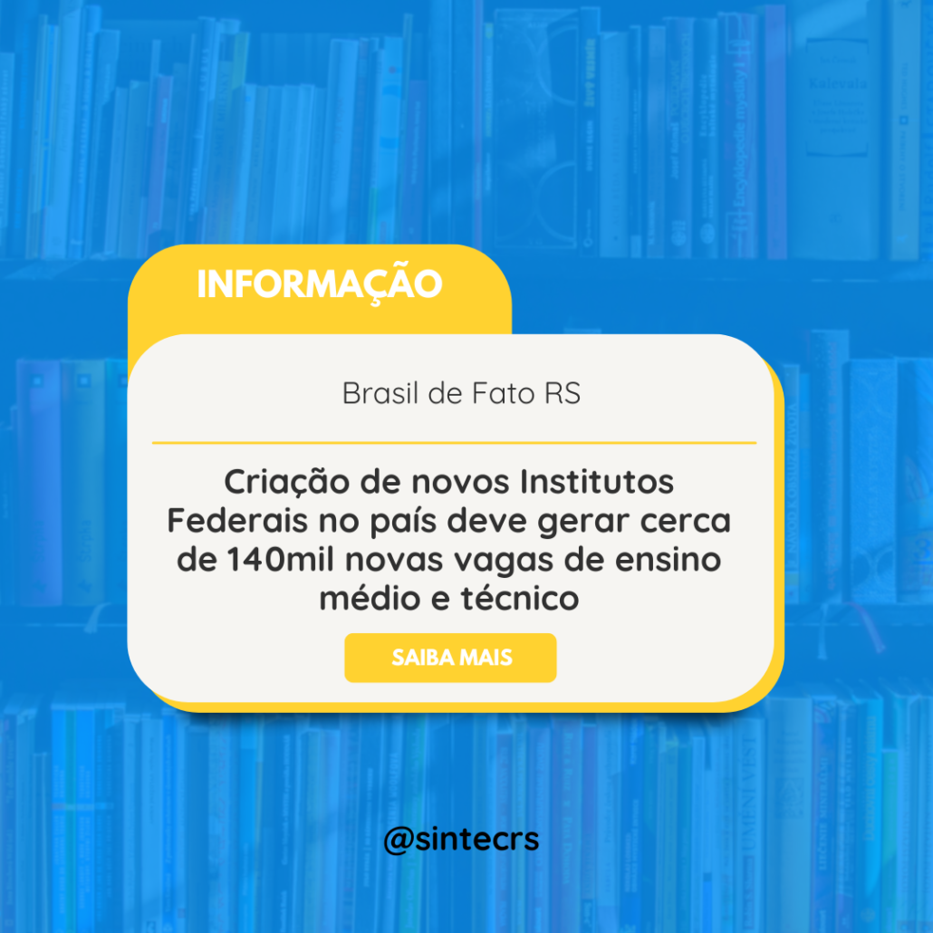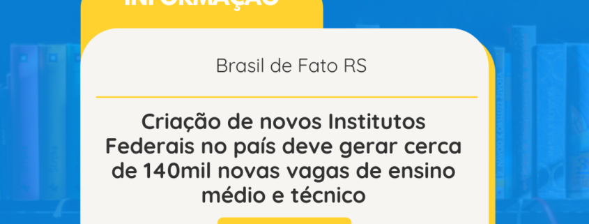 Recentemente o governo federal anunciou a criação de 100 novos campi dos Institutos Federais de Educação, Ciência e Tecnologia (IFs) em todo o Brasil, até o final do mandato do presidente Luiz Inácio Lula da Silva (PT), em 2026. No total, em todo o país, a ação deve gerar mais de 140 mil novas vagas para ensino médio e técnico. O Rio Grande do Sul vai receber cinco novas unidades, que devem gerar cerca de 7 mil novas vagas.