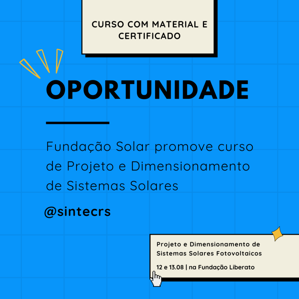 O curso de Projeto e Dimensionamento de Sistemas Solares Fotovoltaicos Conectados à Rede, promovido pela Fundação Solar em parceria com a Escola Técnica Liberato está com as inscrições abertas! As aulas ocorrerão nos dias 12 e 13 de agosto na Fundação Liberato, das 19h às 22h na sexta-feira e das 08h às 17h no sábado.