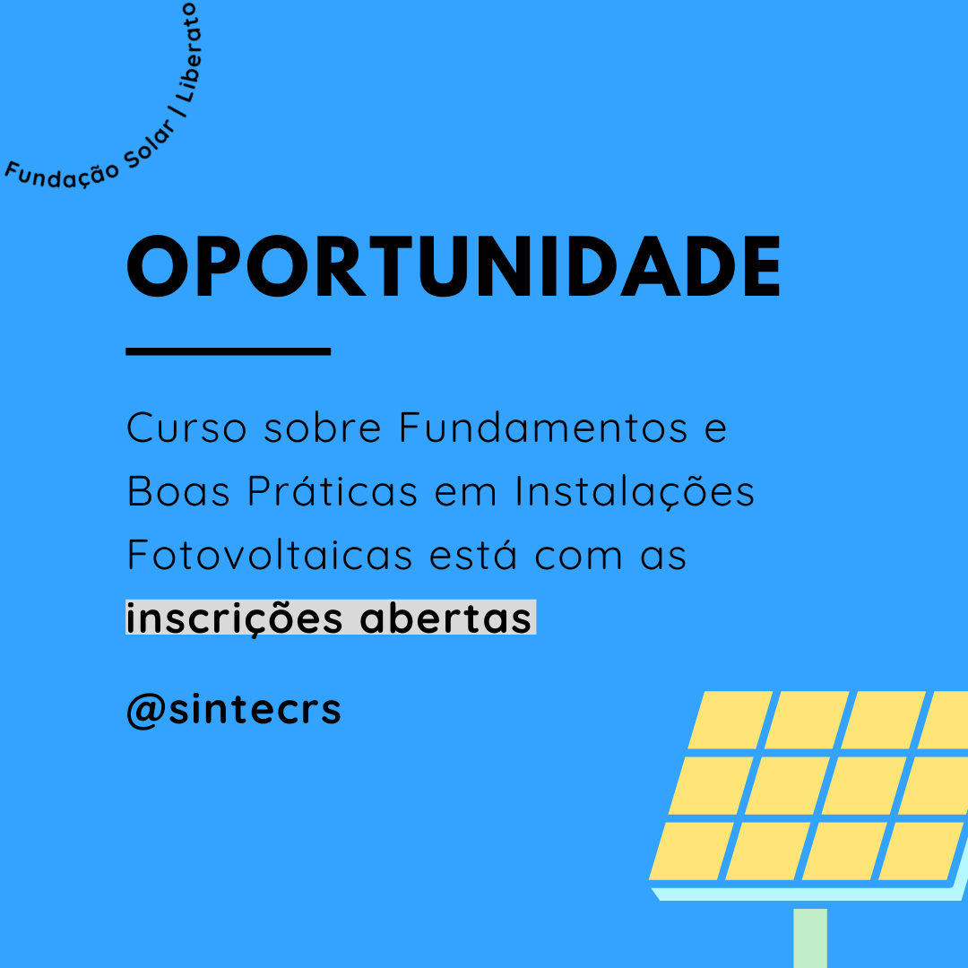 O curso de Fundamentos e Boas Práticas em Instalações Fotovoltaicas, promovido pela Fundação Solar em parceria com a Liberato, está com as inscrições abertas! O programa inicia no dia 24 de fevereiro e será desenvolvido a partir de um intensivo com três encontros virtuais, das 19h às 21h30min, quarta, quinta e sexta-feira.