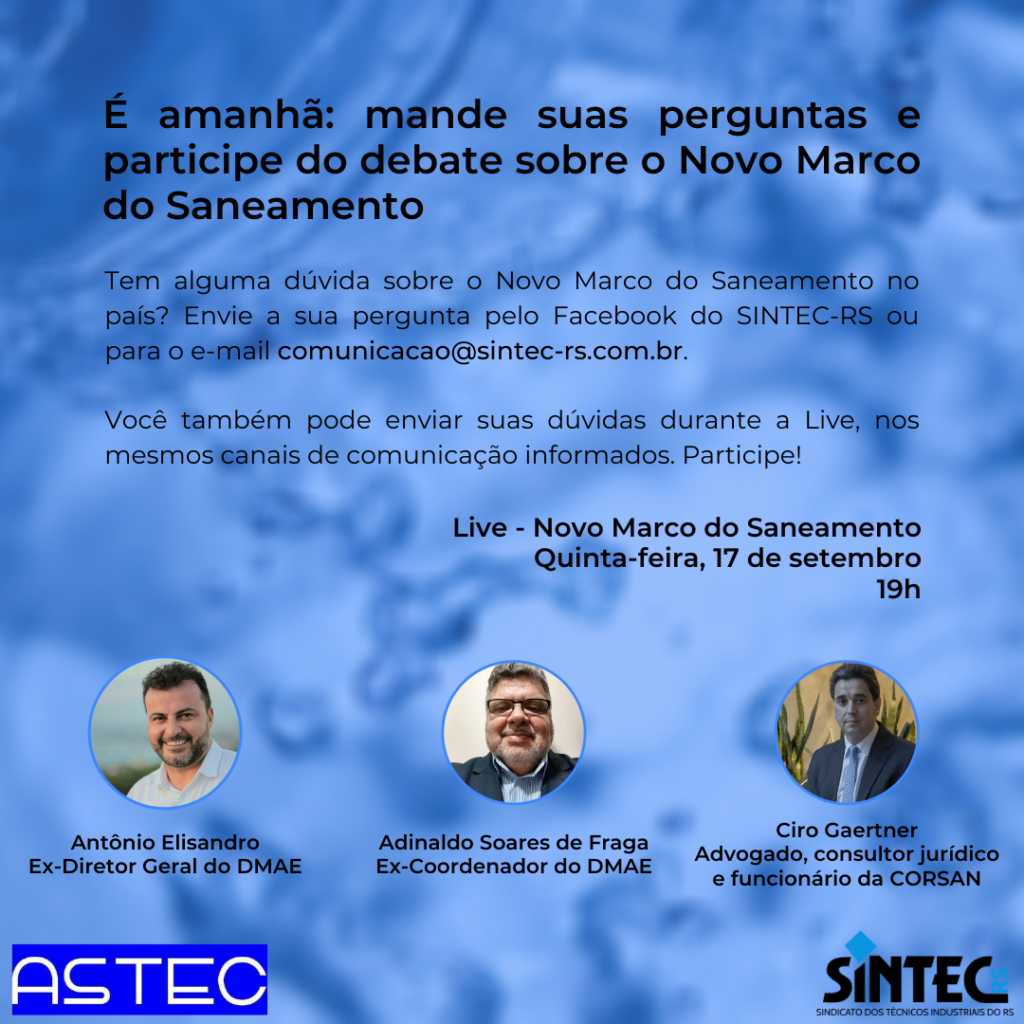 O debate sobre o Novo Marco do Saneamento com Antônio Elisandro, Adinaldo Fraga e Ciro Gaertner, promovido pelo SINTEC-RS em parceria com a ASTEC, é amanhã!