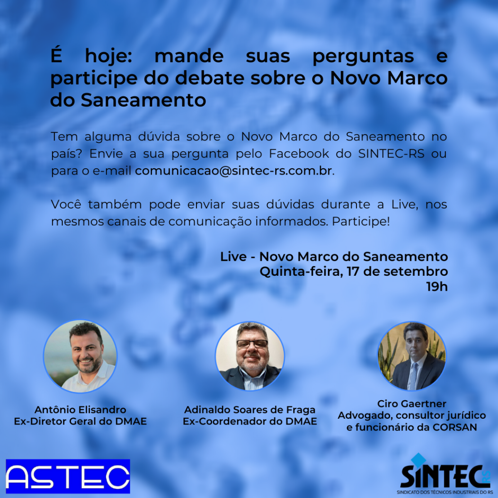 O debate sobre o Novo Marco do Saneamento com Antônio Elisandro, Adinaldo Fraga e Ciro Gaertner, promovido pelo SINTEC-RS em parceria com a ASTEC, é hoje!