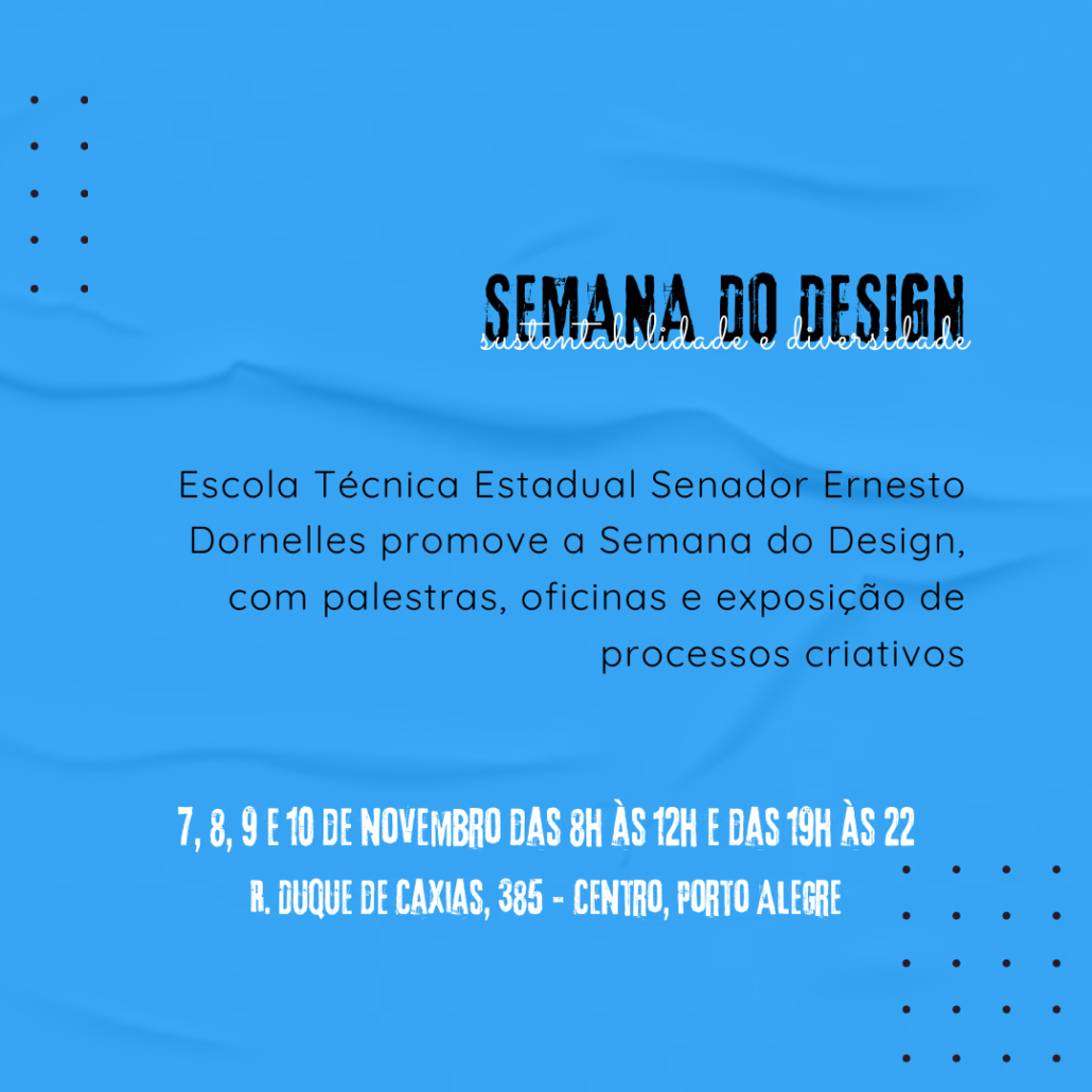 Nos dias 7, 8, 9 e 10 de novembro a Escola Técnica Estadual Senador Ernesto Dornelles promove a Semana do Design, com palestras, oficinas e exposição de processos criativos na escola. A feira é aberta para visitação do público e a entrada é franca.