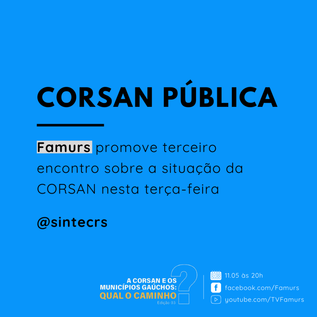 A Federação das Associações de Municípios do Rio Grande do Sul – Famurs promove nesta terça-feira, 11, a partir das 20h, a terceira edição da live “A Corsan e os municípios gaúchos: Qual o caminho?”. O encontro pretende debater os impactos legais e contratuais nos municípios gaúchos com a possível privatização da CORSAN.