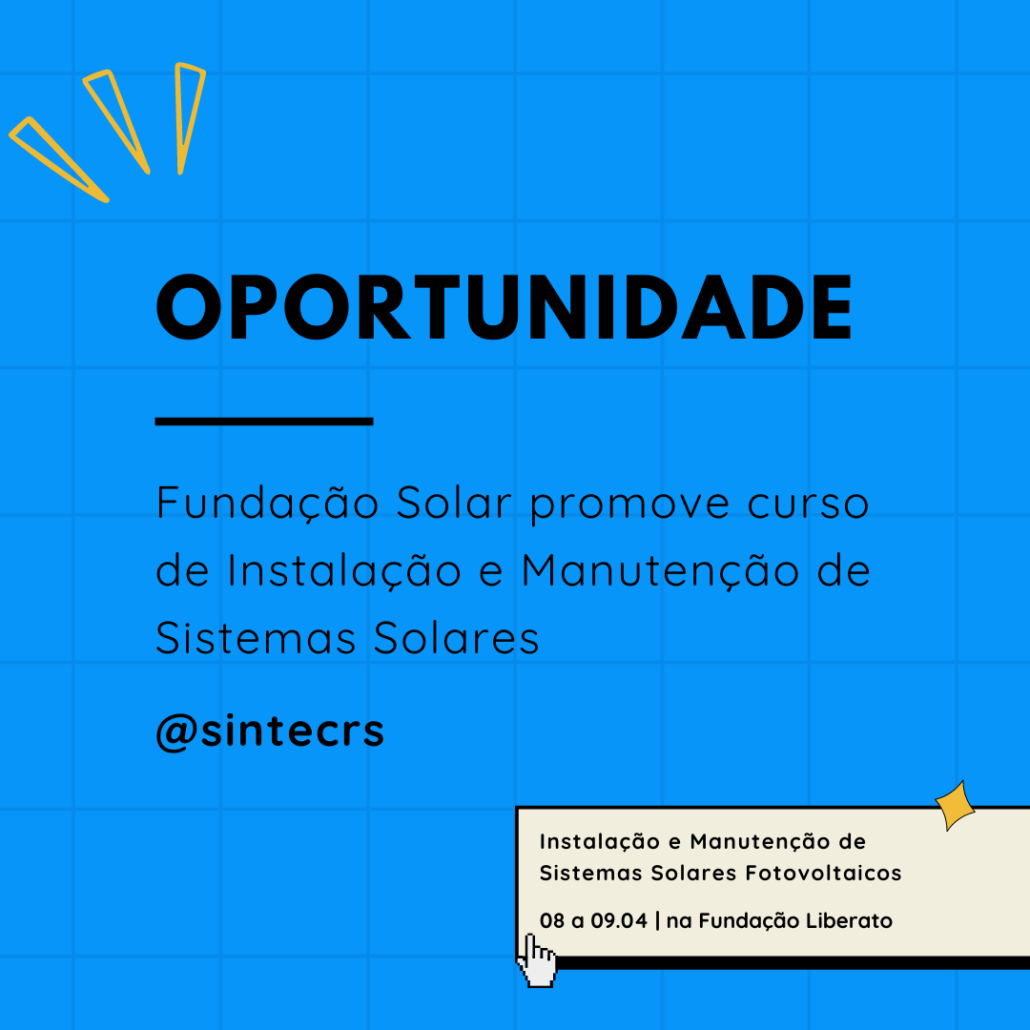 O curso de Instalação e Manutenção de Sistemas Solares Fotovoltaicos Conectados à Rede, promovido pela Fundação Solar em parceria com a Escola Técnica Liberato está com as inscrições abertas! As aulas ocorrerão nos dias 8 e 9 de abril na Fundação Liberato, das 19h às 22h na sexta-feira e das 08h às 17h no sábado. O curso será realizado com todos os cuidados necessários para este momento de pandemia. As vagas são limitadas!