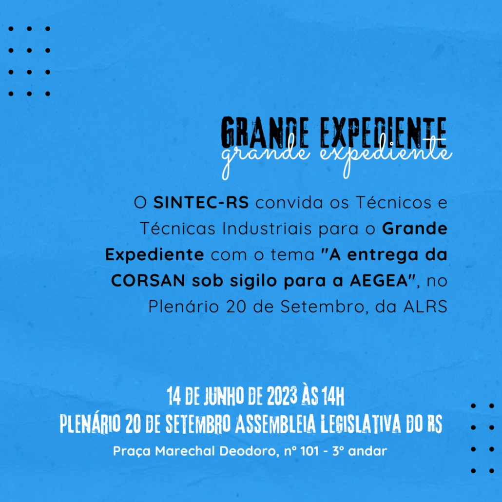 Na próxima quarta-feira, 14, acontece o Grande Expediente com o tema “A entrega da CORSAN sob sigilo para a AEGEA”, de proposição do deputado Jeferson Fernandes. O evento ocorrerá no Plenário 20 de Setembro, na Assembleia Legislativa do RS.