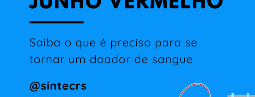 Durante todo o mês de junho a campanha Junho Vermelho chama a atenção para a importância de doar sangue regularmente. Em apoio à campanha, o SINTEC-RS está incentivando a doação de todos e todas através da ação Vamos Doar e, para participar, basta doar sangue, registrar o momento e marcar o SINTEC-RS nas redes sociais para, juntos, formamos uma grande rede de solidariedade e incentivo às doações. Além disso, desafie mais duas pessoas a fazerem o mesmo.