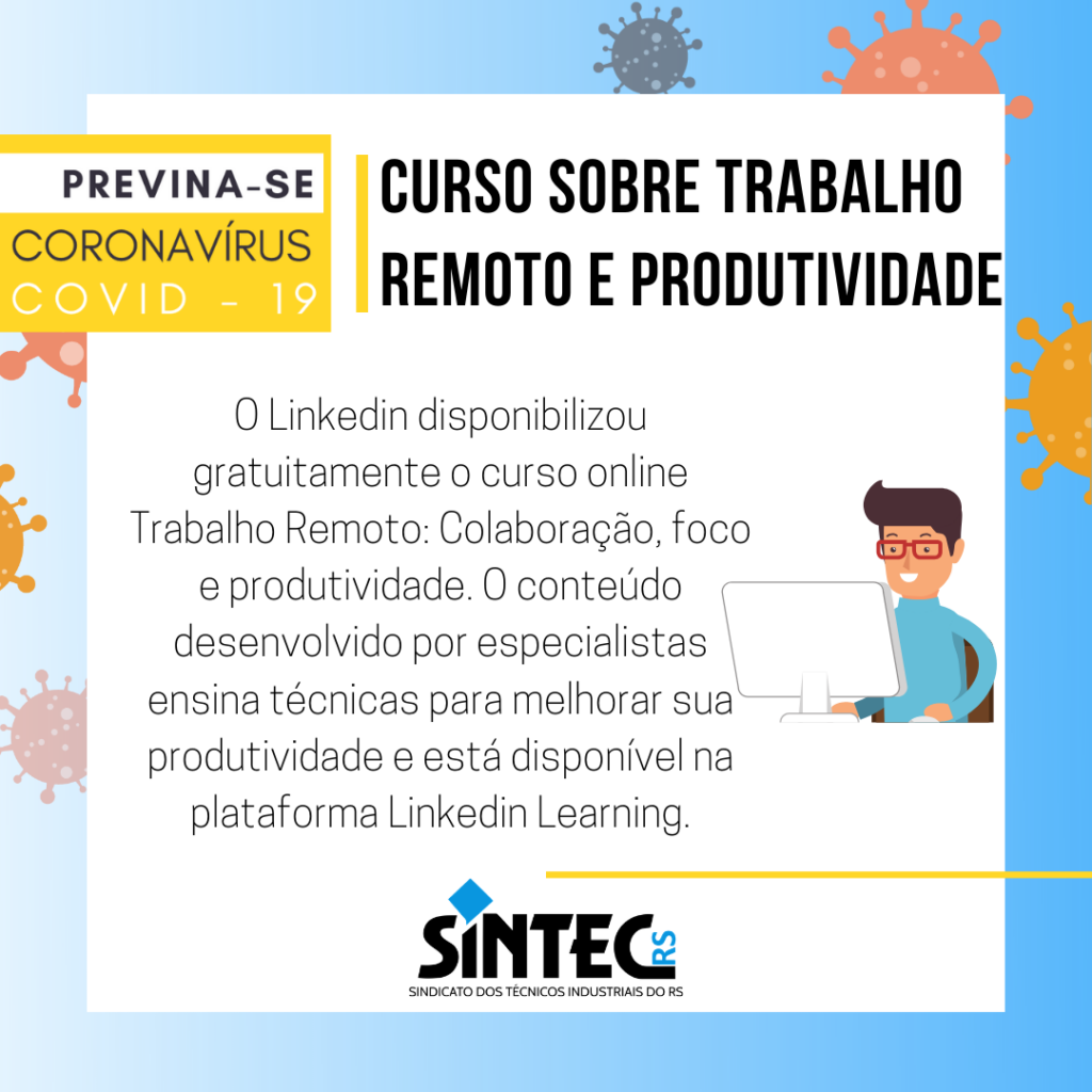 O Linkedin disponibilizou gratuitamente o curso online Trabalho Remoto: Colaboração, foco e produtividade. No total, são 10 aulas com cerca de 11 horas de curso, que ensinam como trabalhar a distância, otimizar o trabalho, interagir com a equipe e realizar tarefas diárias de forma eficaz.