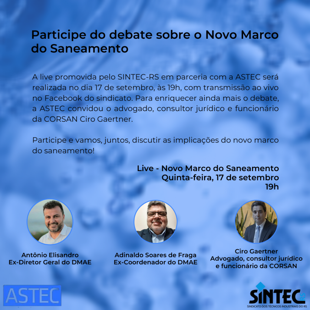 A live promovida pelo SINTEC-RS em parceria com a ASTEC será realizada no dia 17 de setembro, às 19h, com transmissão ao vivo no Facebook do sindicato. Para enriquecer ainda mais o debate, a ASTEC convidou o advogado, consultor jurídico e funcionário da CORSAN Ciro Gaertner.