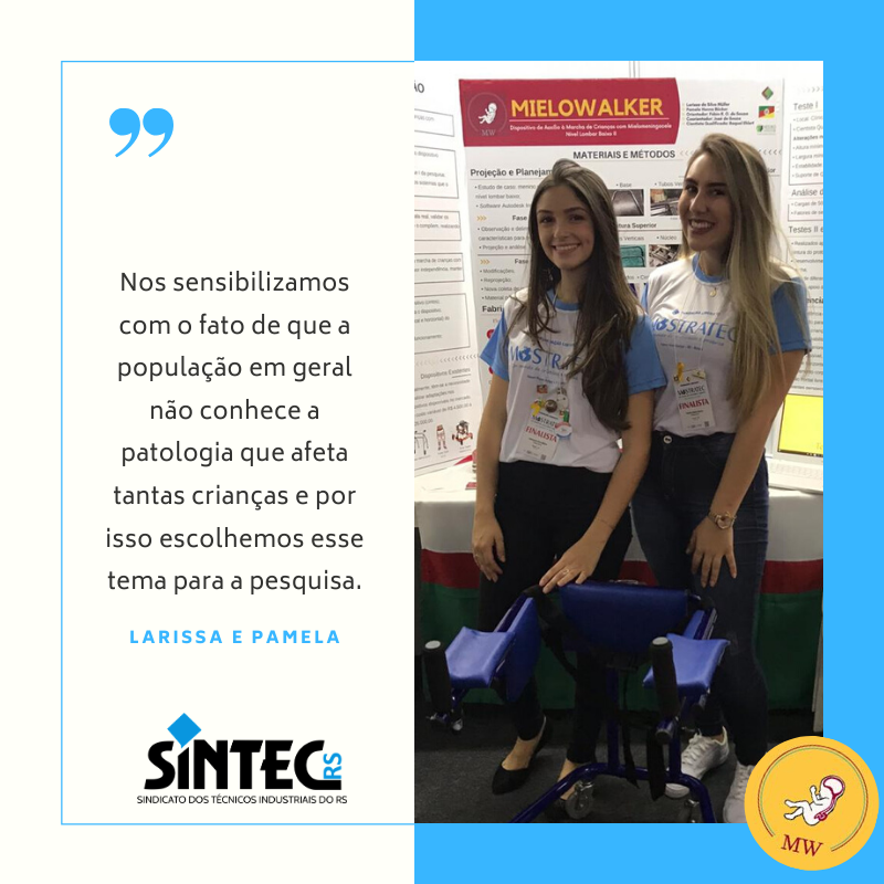 Projetado pelas estudantes de Mecânica Larissa Müller e Pamela Bücker, com a orientação da fisioterapeuta Raquel Ehlert, o dispositivo auxilia crianças com Mielomeningocele Nível Lombar Baixo – doença que causa paraplegia flácida e alteração sensitiva abaixo do nível da lesão, acompanhada de comprometimento neurológico, urológico e ortopédico.