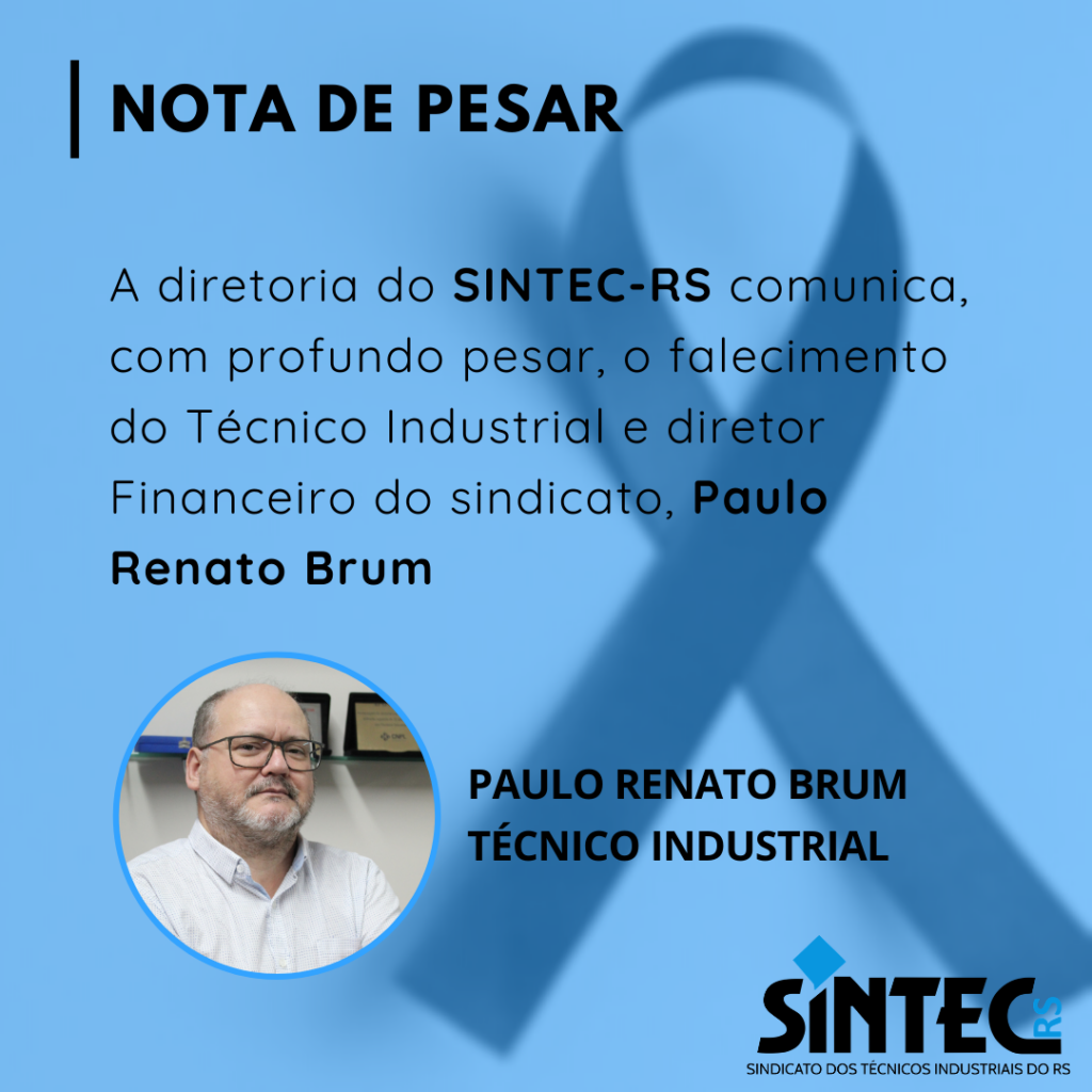 A diretoria do SINTEC-RS comunica, com profundo pesar, o falecimento do Técnico Industrial, grande amigo e diretor Financeiro do sindicato, Paulo Renato Brum, ocorrido na tarde de domingo, 22 de novembro. Paulo Brum tinha 54 anos e estava internado no Hospital de Alvorada em decorrência da COVID-19.