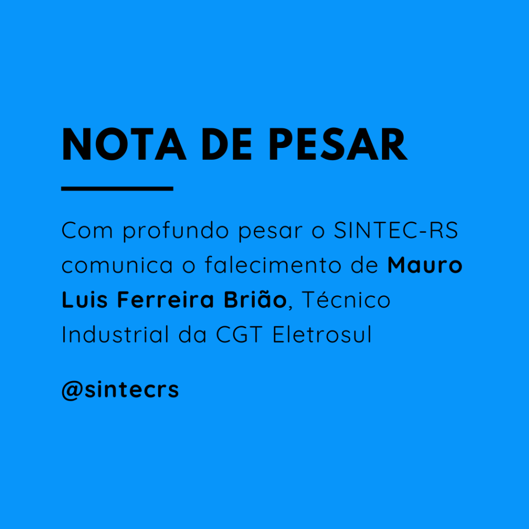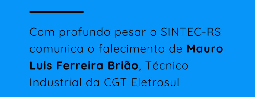 É com profundo pesar o SINTEC-RS comunica o falecimento de Mauro Luis Ferreira Brião, Técnico industrial da Eletrobras – CGT Eletrosul, ocorrido nesta quarta-feira, 30 de junho, em Porto Alegre.