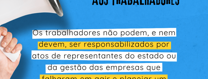 Os trabalhadores não podem – e nem devem – ser responsabilizados por atos de representantes do estado ou da gestão das empresas, que falharam em agir e planejar um atendimento adequado à sociedade. Os trabalhadores estão submetidos a todas as intempéries do tempo, cumprindo longas e exaustivas jornadas de trabalho, forte pressão psicológica e dificuldades até para fazer seus devidos e merecidos intervalos de descanso.