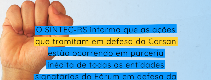 Estamos em uma etapa decisiva no processo de entrega da Corsan. O momento requer vigilância e estratégia. O SINTEC-RS informa que as ações que tramitam em defesa da Corsan pública estão ocorrendo em parceria inédita de todas as entidades signatárias do Fórum em defesa da água pública. Os trabalhos que defendem o cancelamento do leilão, a quebra do sigilo sobre o processo de venda e as graves denúncias sobre a interferência da AEGEA na gestão da Corsan possuem frentes de batalha compostas por vários sindicatos e associações, que estão – desde o inicio da luta – prestando de forma cooperativa suporte técnico, jurídico e financeiro. Nesse momento, mais do que nunca, a união está fazendo a diferença! Esse sempre foi nosso lema: juntos somos mais fortes!