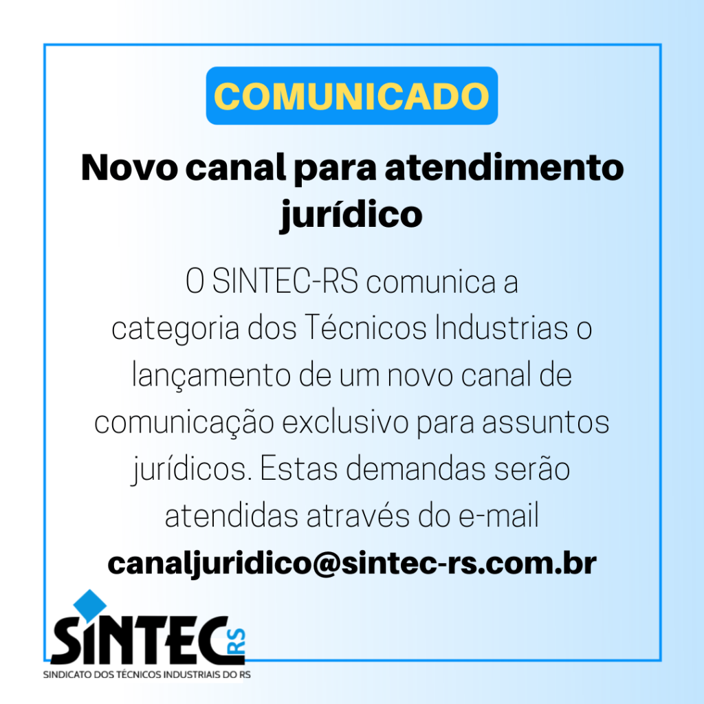 O SINTEC-RS comunica a categoria dos Técnicos Industrias o lançamento de um novo canal de comunicação exclusivo para assuntos jurídicos. A decisão, estabelecida em conjunto com a assessoria jurídica do sindicato, visa garantir mais agilidade e transparência no atendimento das solicitações e processos judiciais da entidade. Com isso, as demandas jurídicas do SINTEC-RS serão atendidas através do e-mail canaljuridico@magenta-viper-548333.hostingersite.com.